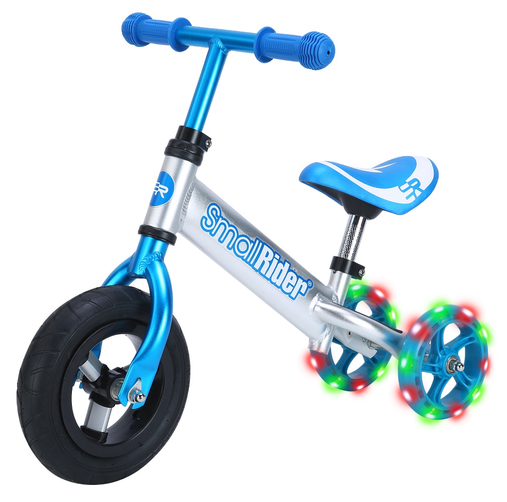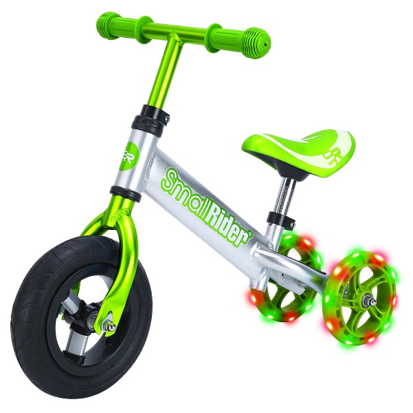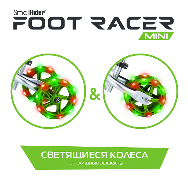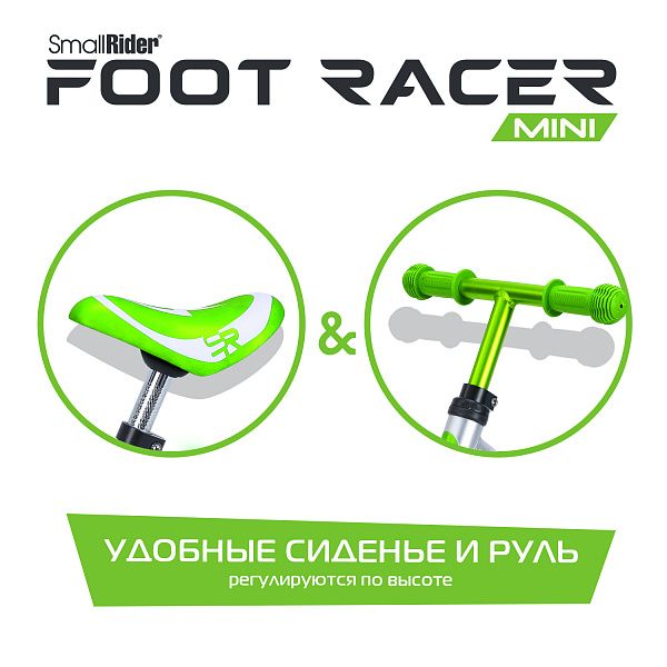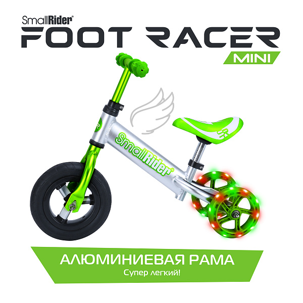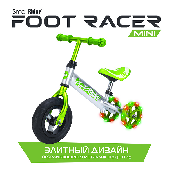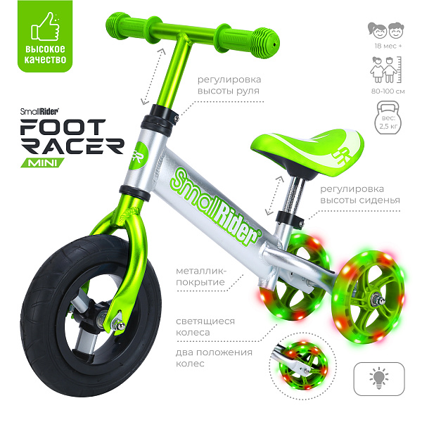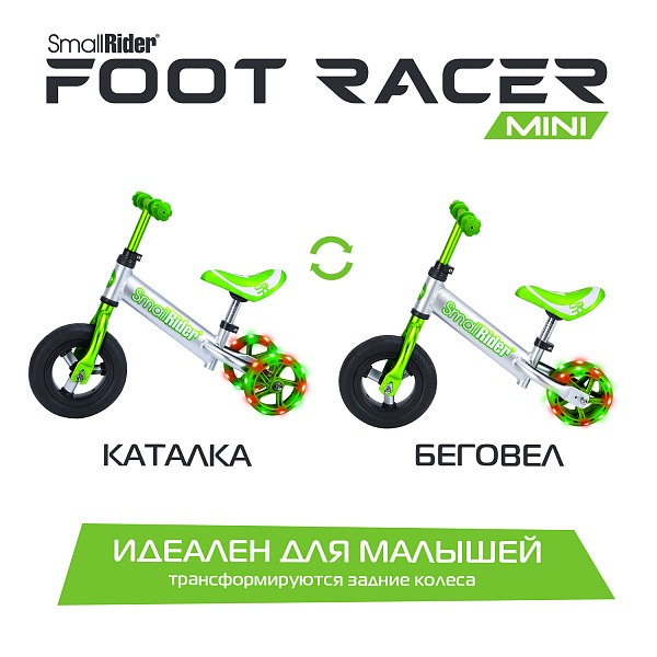 Беговел-трансформер Small Rider Foot Racer mini (Смолл райдер фут рейсер мини) - транспорт, специально спроектированный для детей от 12-18 месяцев до 3-4 лет. Уникальность транспорта заключается в его трансформации. В зависимости от положения колес у ребенка будет каталка или беговел. При этом транспорт максимально легкий и устойчивый. Задние колеса светятся, что бы было интереснее кататься. С-идениеимеет регулировку по высоте.