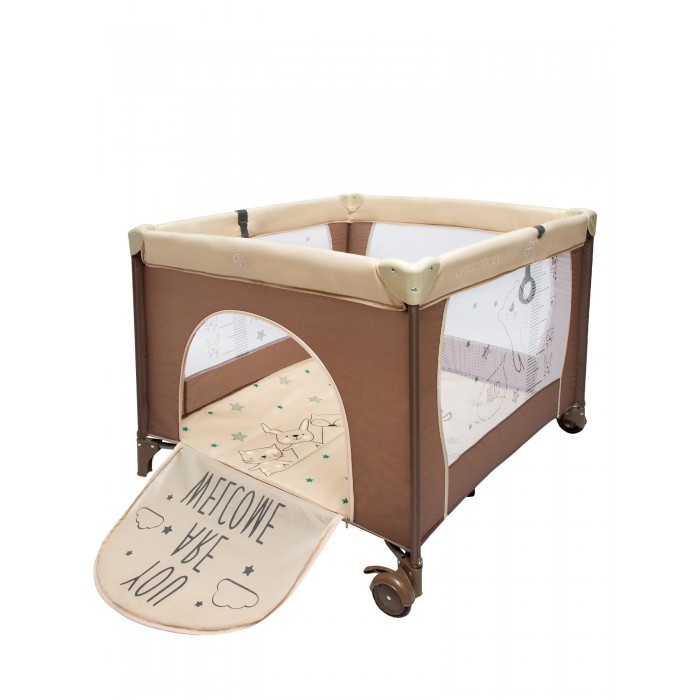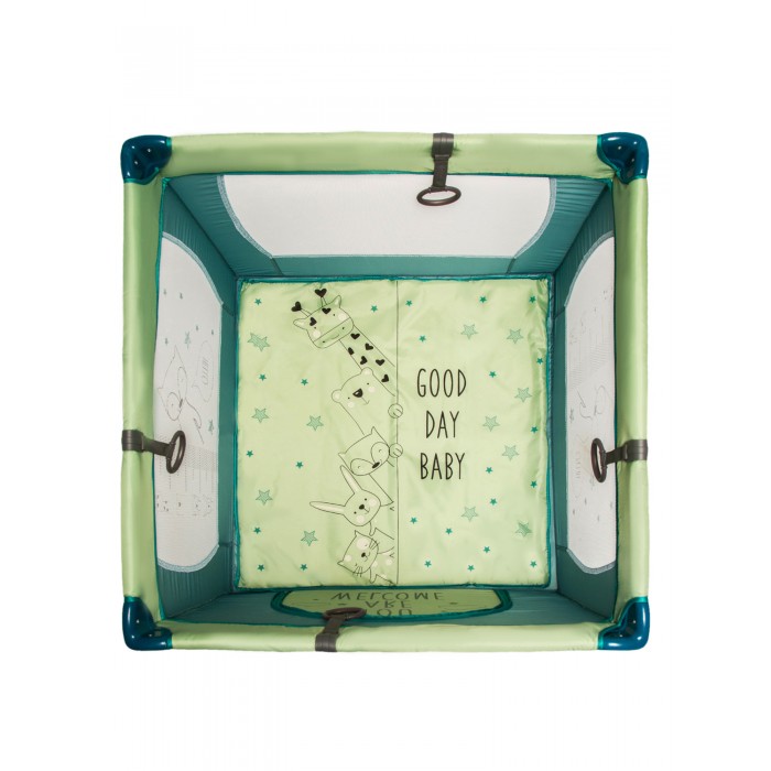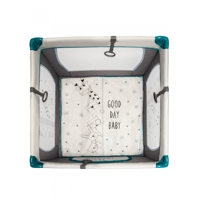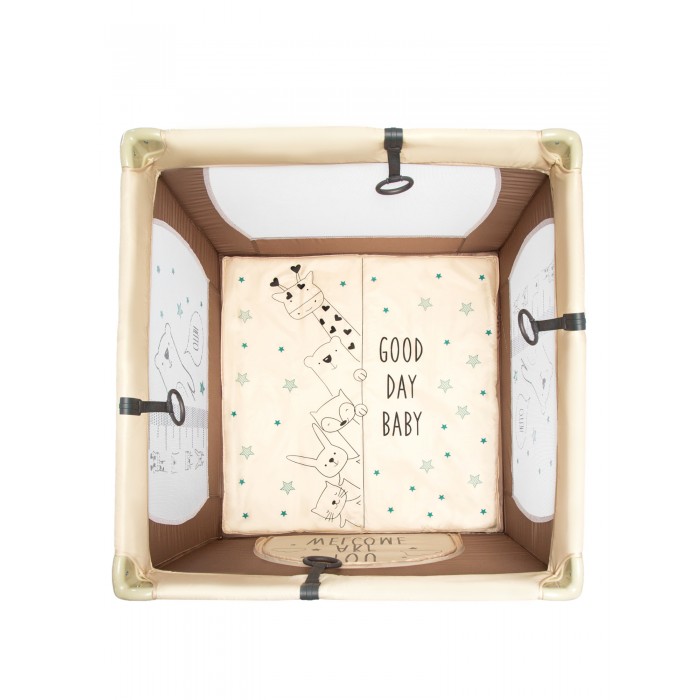 - Удобная система складывания и раскладывания манежа. Стенки оснащены замками с фиксаторами автоматического складывания. В комплекте с манежем идет компактная дорожная сумка с ручками.