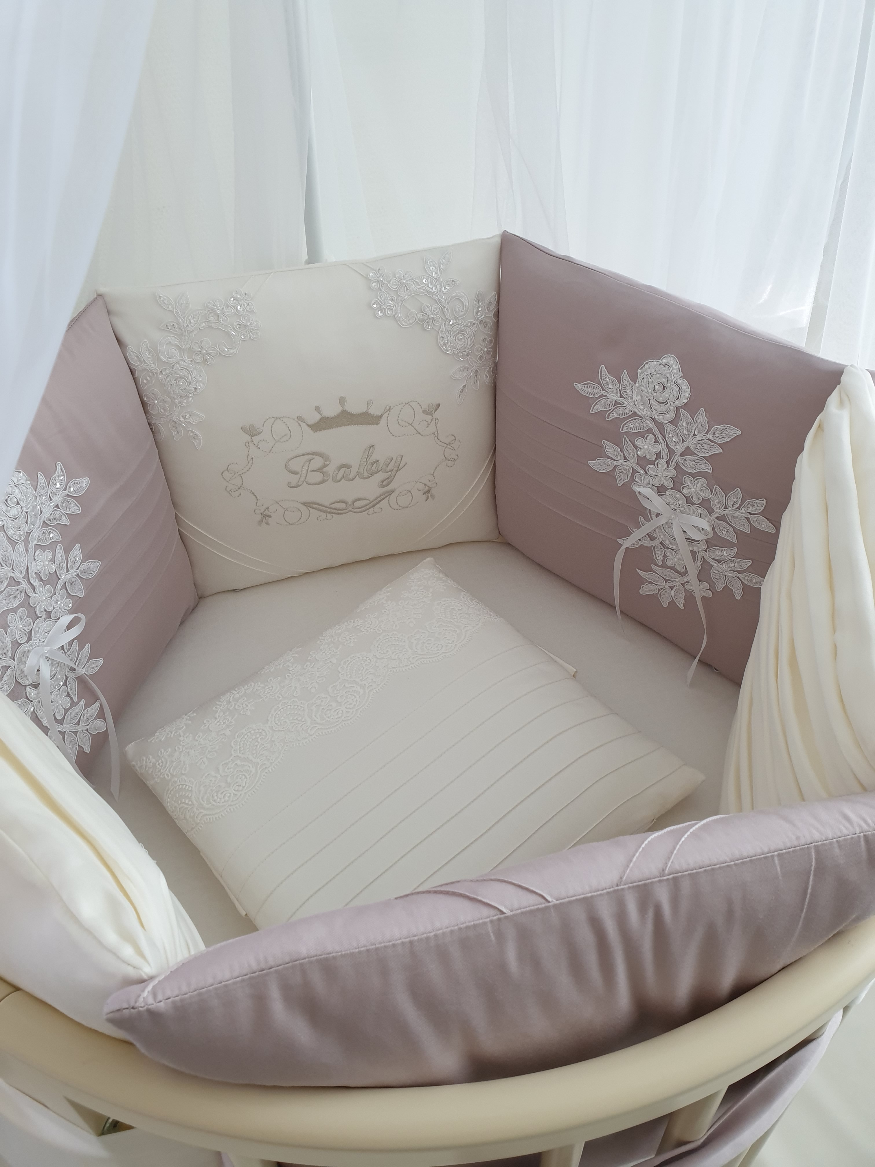 Бортики в круглую-овальную кроватку Ecoline Olivia (Эколайн Оливия) - очень нежный, воздушный комплект из бортиков в детскую кроватку. Бортики выполнены из нежного мерсеризированного хлопка. Все чехлы съемные, что облегчит стирку и уход за бортами. Основной бортик украшен ручной вышивкой и аппликацией. Еще несколько бортиков украшены нежной аппликацией и атласным ленточками. Все бортики крепятся к кроватке с помощью ленточек.