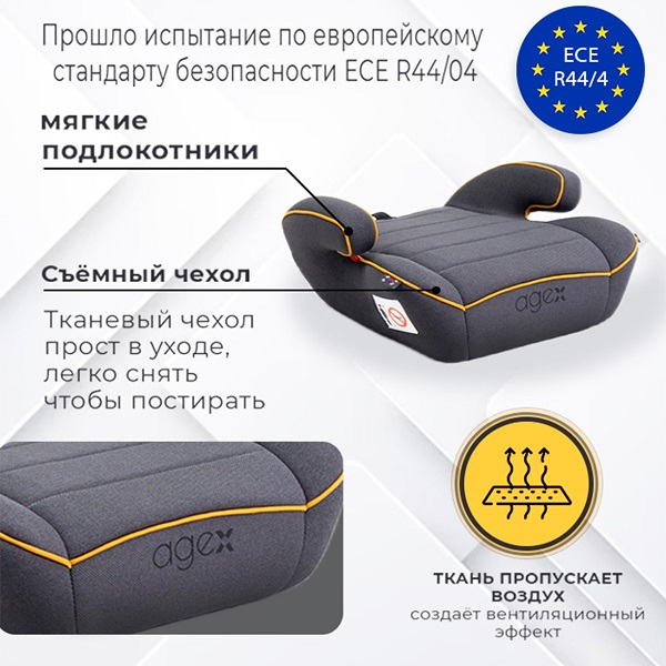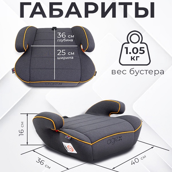 Бустер Agex Lift (Аджекс лифт) - относится к группе 3 и подходит для детей от 125 до 150 см (5-12 лет). Фиксируется с помощью штатного ремня безопасности автомобиля, благодаря чему подойдет для любой машины. Agex Lift разработан и сертифицирован в соответствии со стандартом ECE R44/04. Вы можете не сомневаться не только в его качестве, но и безопасности!