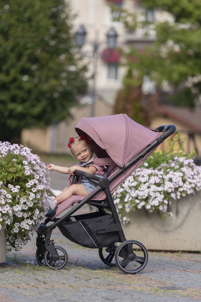 Коляска отличается более мягким ходом, благодаря амортизации на всех колесах и регулируемой ручкой для родителей.