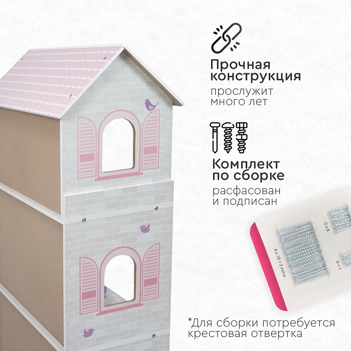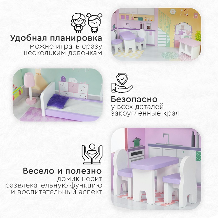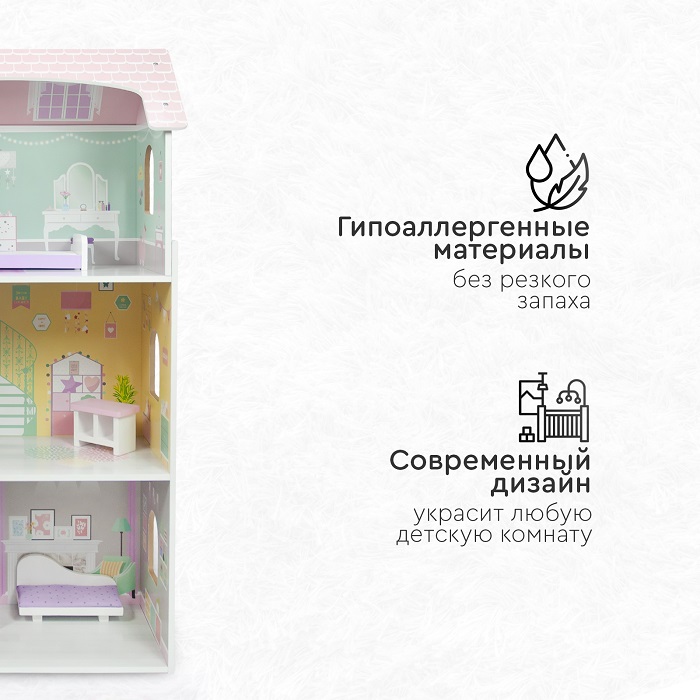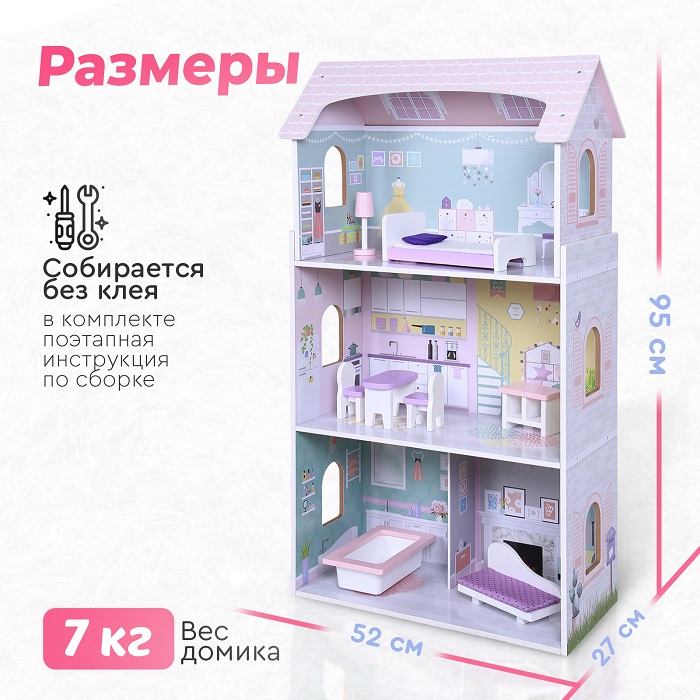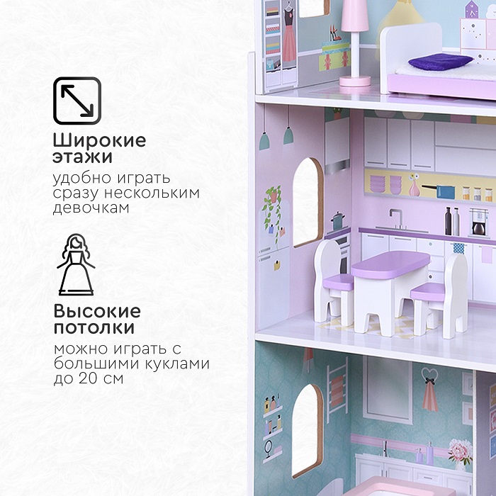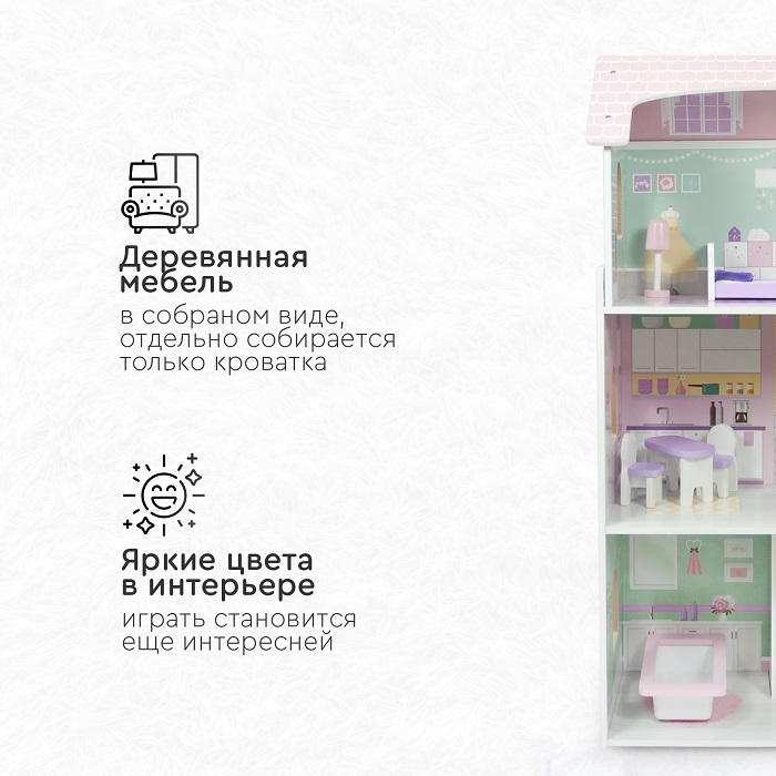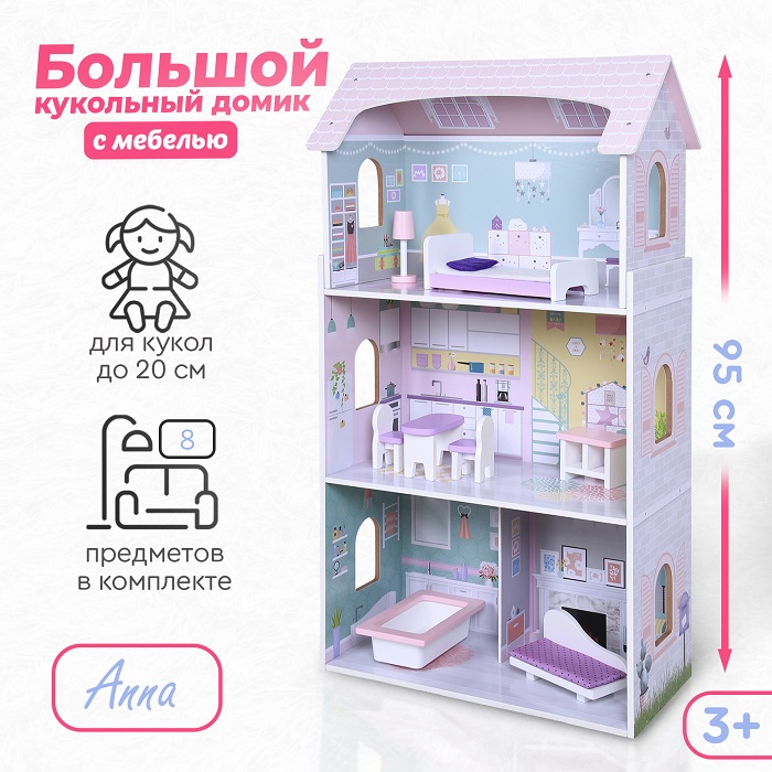 Деревянный дом для кукол Tomix Anna (Томикс Анна) - это мечта любой девочки! На первом этаже расположена гостиная и ванная комната, на втором этаже - кухня, третий этаж – уютная спальня. Мебель и предметы интерьера, которые идут в комплекте, сделают игру максимально реалистичной. Нежные цвета интерьера придутся по душе маленьким принцессам! Дом имеет прочную деревянную конструкцию, благодаря чему прослужит много лет. Собирается с помощью понятной поэтапной инструкции (для сборки понадобится крестовая отвертка). У всех элементов дома закругленные края, что делает игру безопасной для маленьких детей.