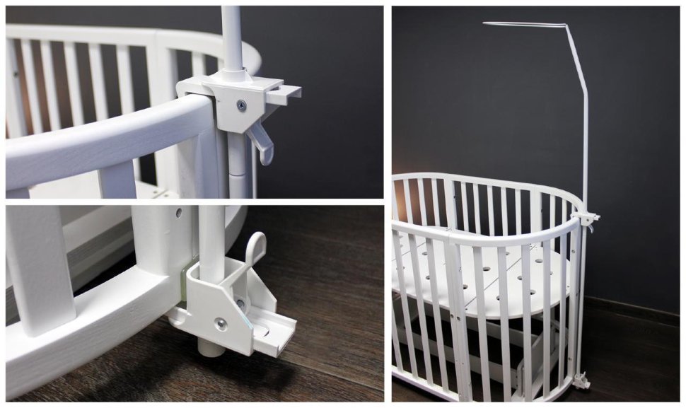 Благодаря универсальному креплению, кронштейн для балдахина можно закрепить на любой детской кроватке.