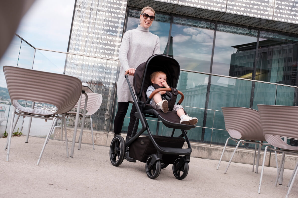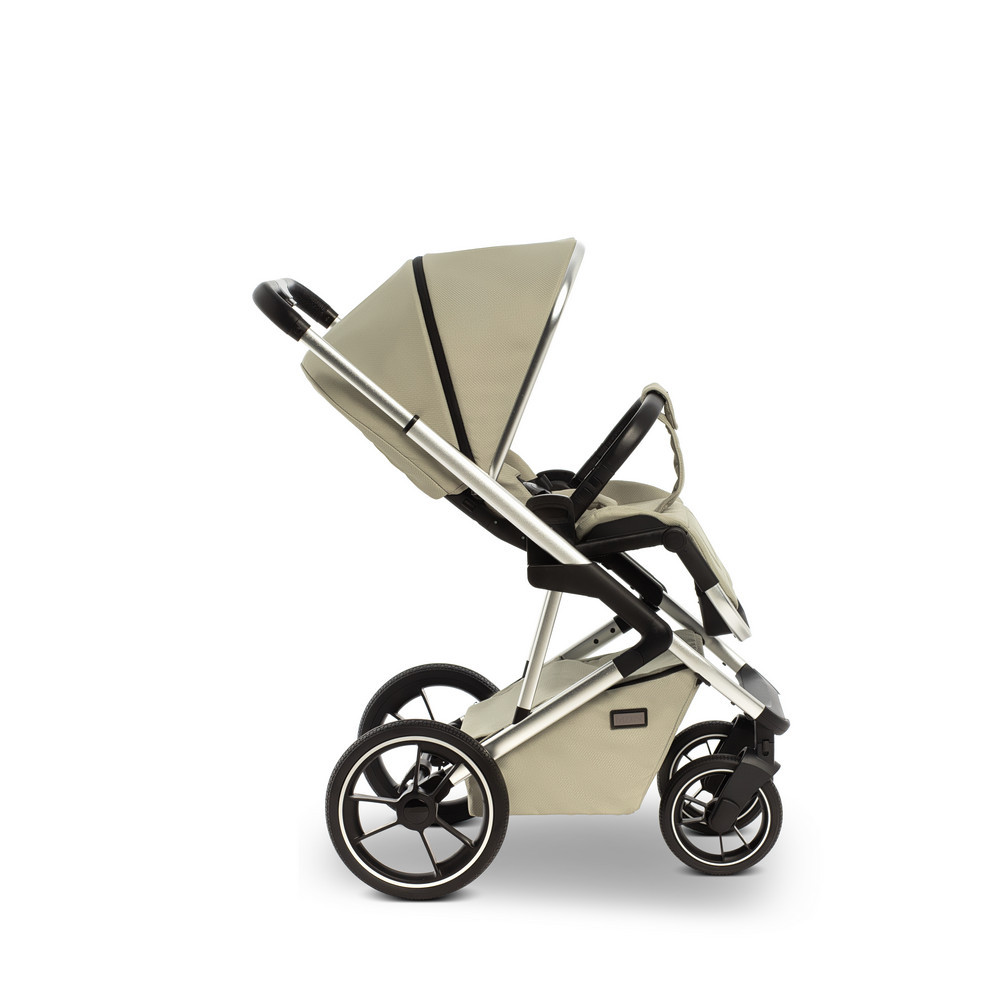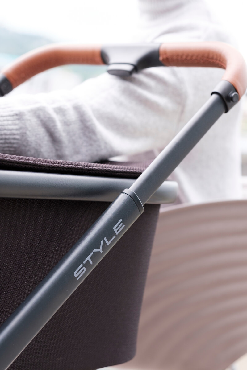 Рама коляски выполнена из алюминия и отличается надежность и практичностью. У коляски очень простое и компактное сложение с удобной фиксацией колес, чтобы они не мешались при транспортировке. Это первая коляска Moon с закрытой на молнии корзиной для покупок. У нее очень большой внутренний размер, что позволит взять на прогулку все, что необходимо. Для удобного управления родителям любого роста предусмотрена телескопическая ручка из приятной качественной эко кожи. Большое внимание в этой модели уделено проходимости коляски, для этого предусмотрены большие колеса из материала шин авто и отличная амортизация.