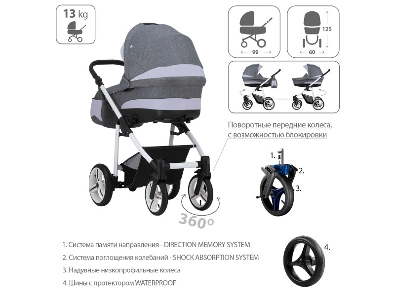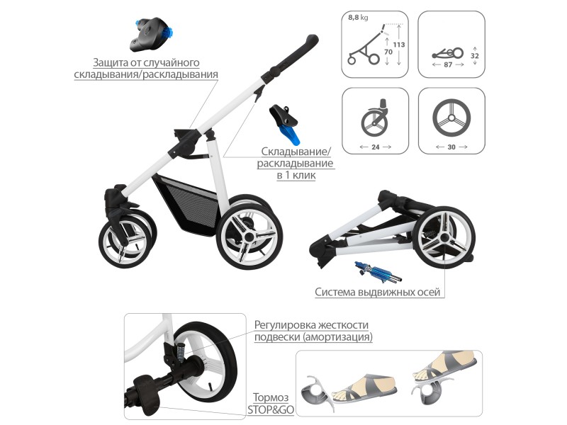 Дополнительно на раму коляски устанавливается автокресло для новорожденных группы 0+, которое уже идет в комплекте.
