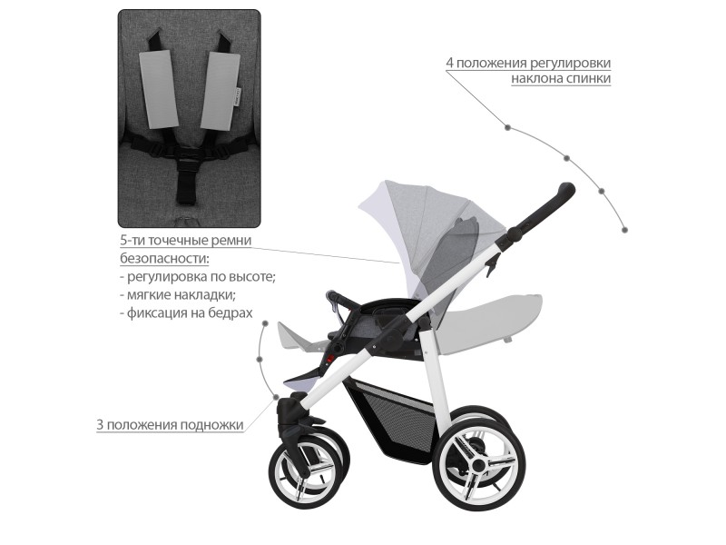 Регулируемые 5-точечные ремни безопасности с мягкими накладками на плечи.