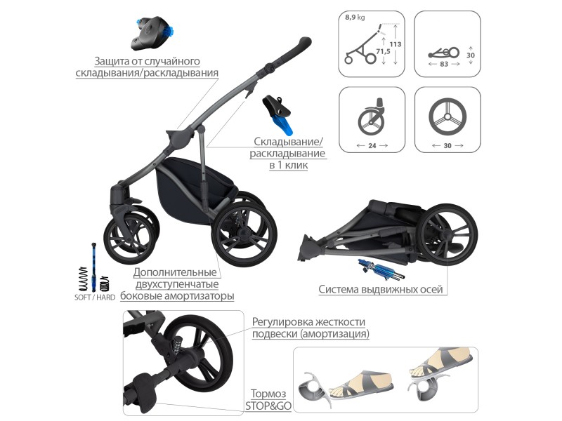 Дополнительные боковые амортизаторы с регулировкой Soft или Hard (мягкий или жесткий), позволяющие адаптировать подвеску, в зависимости от типа дороги.