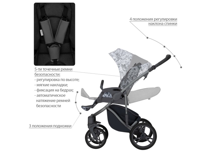 Регулируемые 5-точечные ремни безопасности с мягкими накладками на плечи.