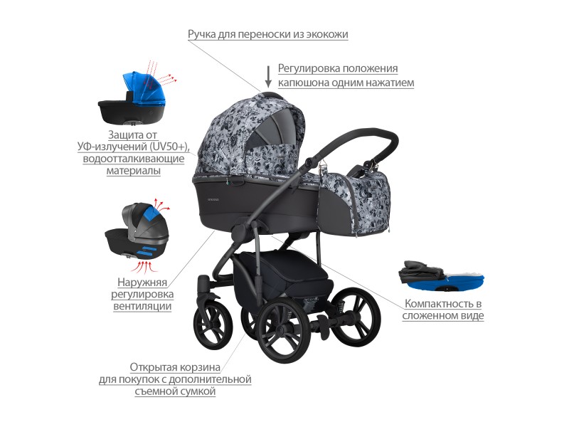 Обивка коляски: водоотталкивающая, съемная, с УФ-защитой 50+.