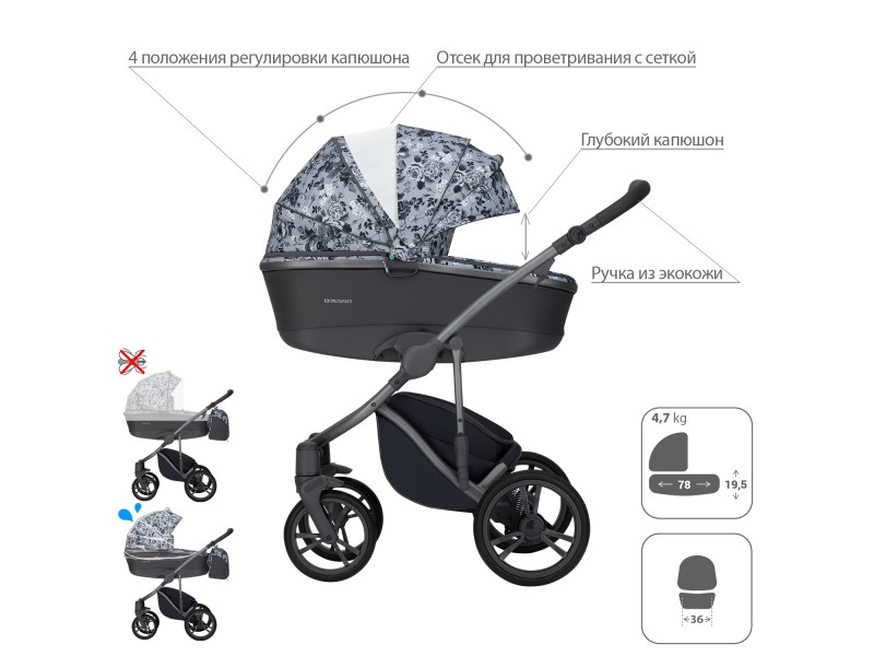 Для переноски люльки: удобные боковые ручки, ручка на капюшоне.