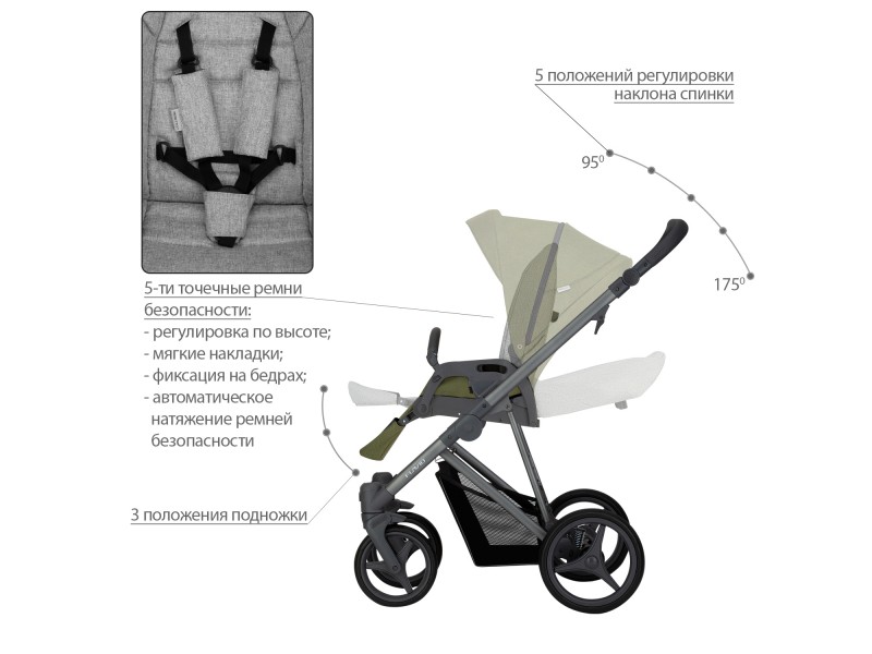 Регулируемые 5-точечные ремни безопасности с мягкими накладками на плечи.