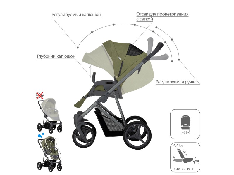 Обивка коляски: водоотталкивающая, съемная, с УФ-защитой 50+.