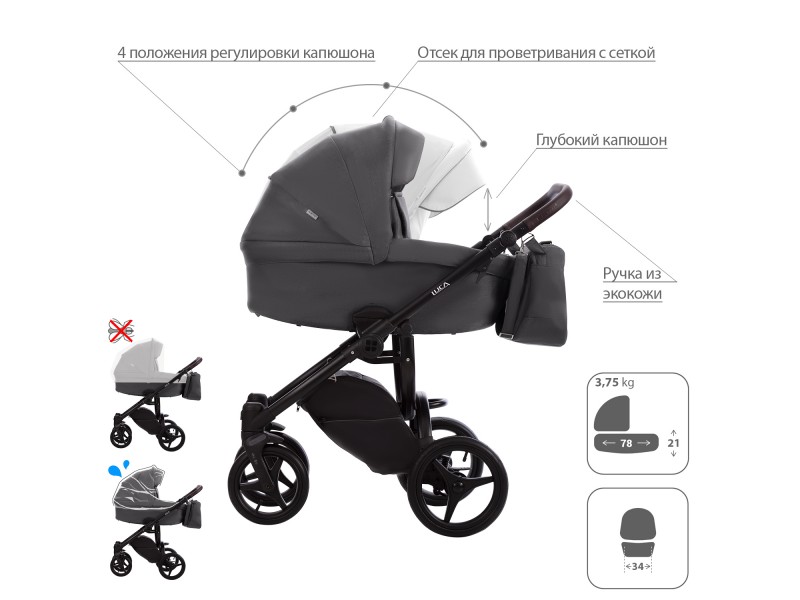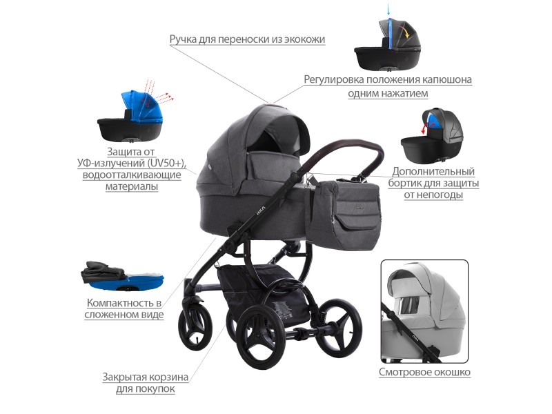 Детская коляска Bebetto Luca 3в1 (Бебетто лука ) - это элегантная и функциональная коляска, с которой каждая прогулка с ребенком станет приятным приключением. Данная модель сочетает в себе оригинальный дизайн и инновационные решения, создающие комфорт для Вас и Вашего малыша. В Bebetto Luca люлька изготовлена из легкого, прочного и инновационного материала, который обладает отличными теплоизоляционными свойствами и является экологически безопасным. Для Вашего удобства в коляске предусмотрено 2 способа регулировки капора спального блока. В данной модели Вы можете отрегулировать капор легким нажатием на капюшон спального блока сверху или при помощи двух кнопок, расположенных с внутренней стороны люльки. Кроме того, к неоспоримым преимуществам коляски можно отнести наличие смотрового окошка для мамы на ветрозащитном бортике. А возможность сложения рамы с прогулочным блоком в независимости от направления установки прогулочного блока (лицом к маме или лицом от мамы) станет приятным дополнением ко всему вышеперечисленному. Bebetto Luca – это коляска, созданная с любовью.