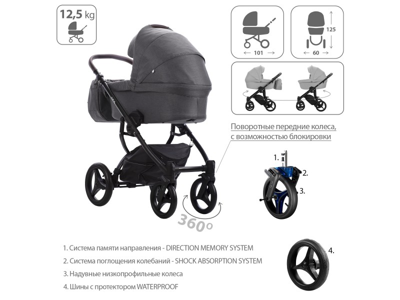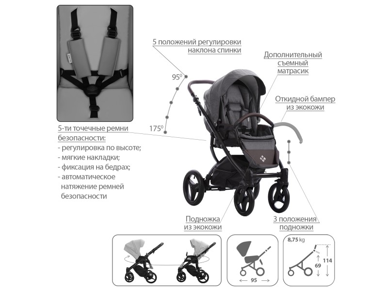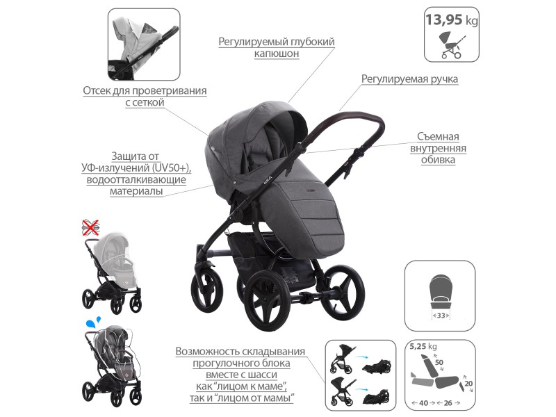 Конструкция данной коляски позволяет устанавливать на нее люльку, сиденье прогулочного блока или автомобильное кресло. Люлька и прогулочный блок реверсивные, их можно устанавливать как «лицом к маме», так и «лицом от мамы». Спальный вариант коляски предназначен для детей в возрасте от 0 до 7 месяцев (весом до 9 кг), прогулочный блок рассчитан на возраст от 7 месяцев до 3 лет (вес ребенка до 15 кг).