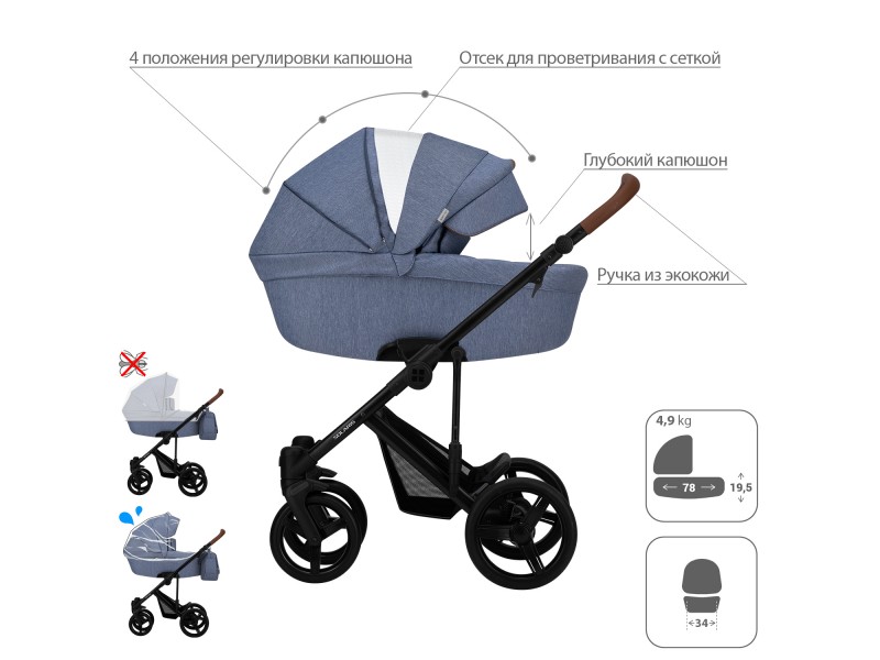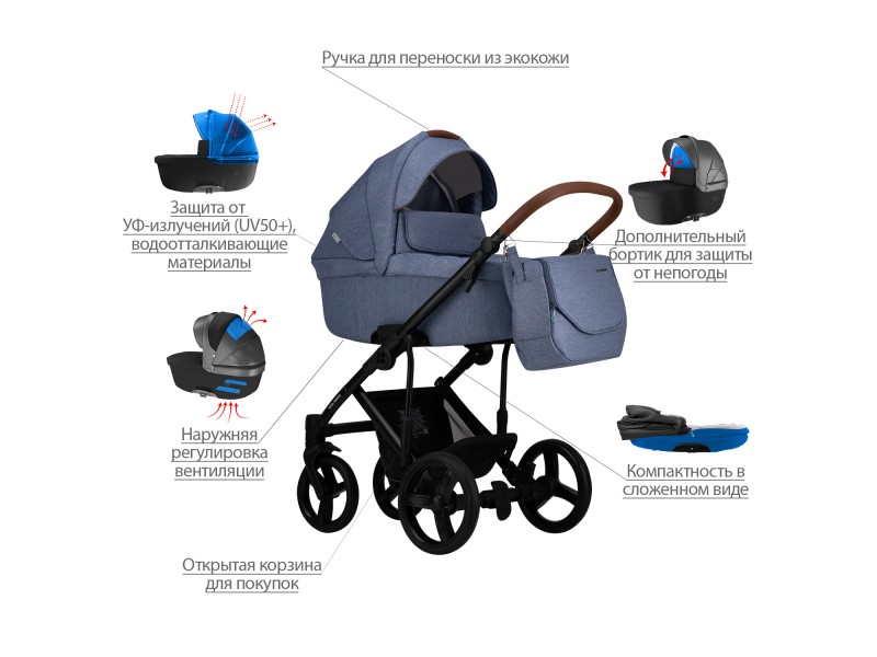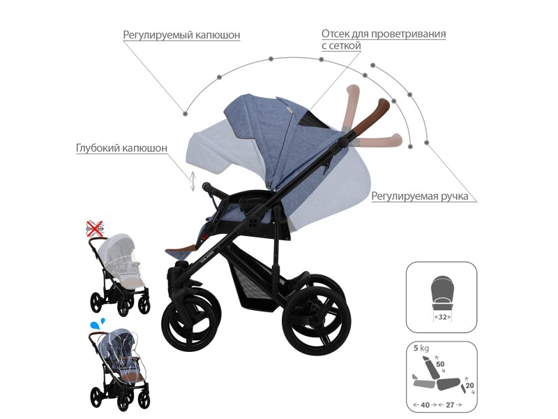 - Обивка коляски: водоотталкивающая, съемная, с УФ-защитой 50+.