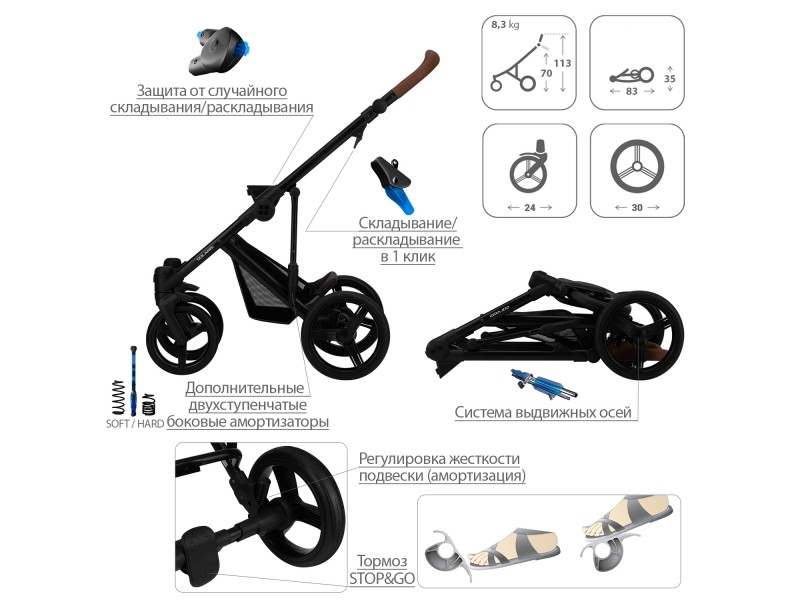 К неоспоримым преимуществам коляски относится отличная ходовая часть. Современные бескамерные колеса с максимально простым уходом и повышенным сроком эксплуатации. Передние колеса оснащены системой SAS и поворотным механизмом с фиксацией. Каждое заднее колесо оснащено пружинной амортизацией, а на раме предусмотрена дополнительная регулируемая амортизация. Вы сможете сами регулировать жесткость подвески в зависимости от веса ребенка и дорожного покрытия. И, конечно, современная тормозная система STOP/GO, которая быстро блокирует оба задних колеса и не портит вашу обувь. Рама коляски выполнена из облегченного алюминия, гарантируя надежность и минимальный вес изделия. Рама очень компактно складывается и фиксируется в сложенном виде, что облегчает хранение или перевозку изделия. Для более компактного сложения коляски, предусмотрено быстрое снятие всех колес. Для удобства управления коляской предусмотрена регулируемая ручка с покрытием из приятной на ощупь эко кожи.