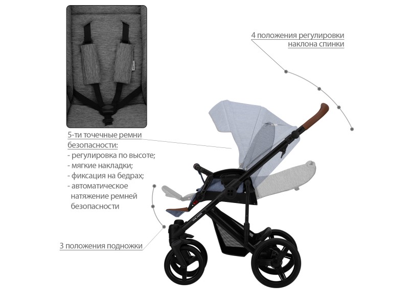 - Регулируемые 5-точечные ремни безопасности с мягкими накладками на плечи.