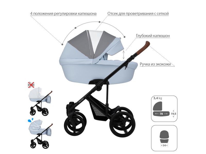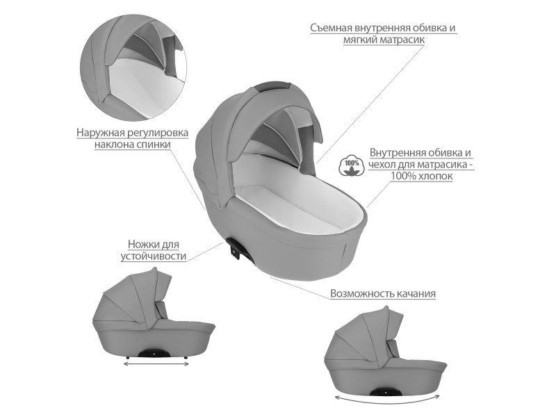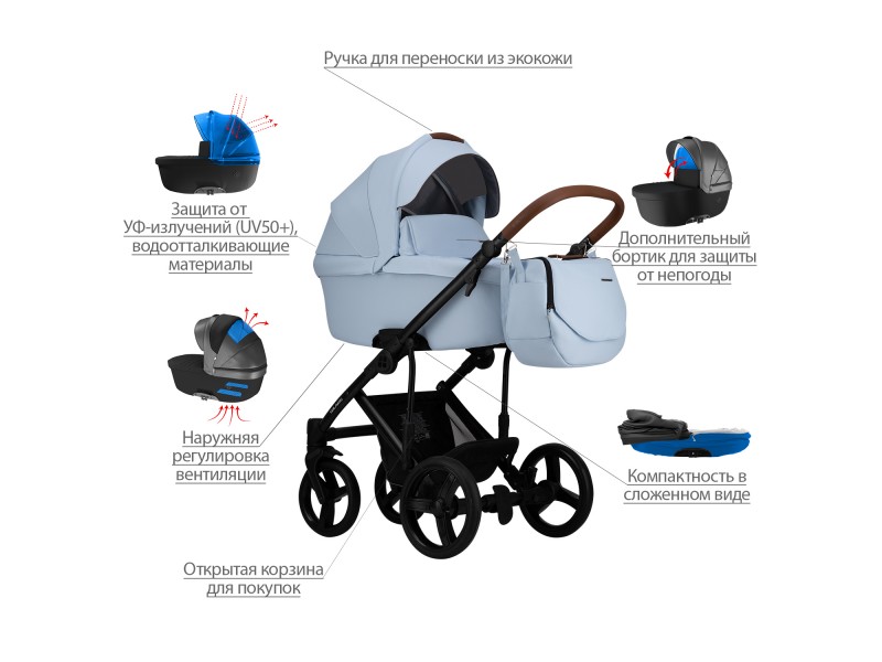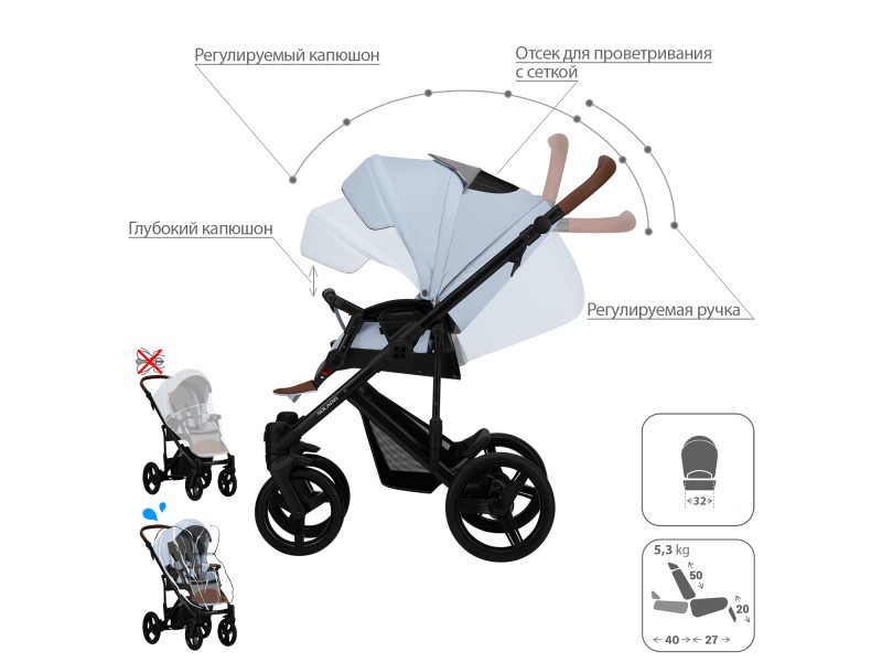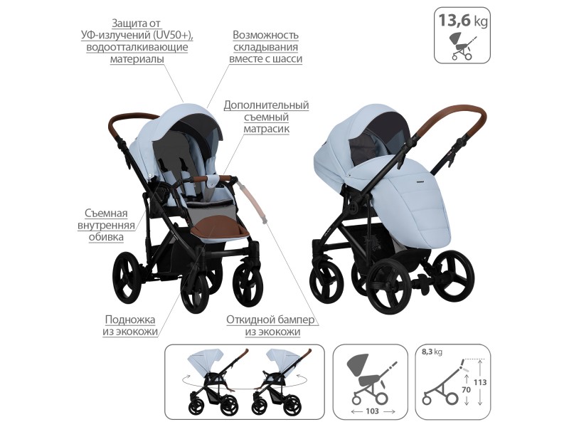 - Обивка коляски: водоотталкивающая, съемная, с УФ-защитой 50+.