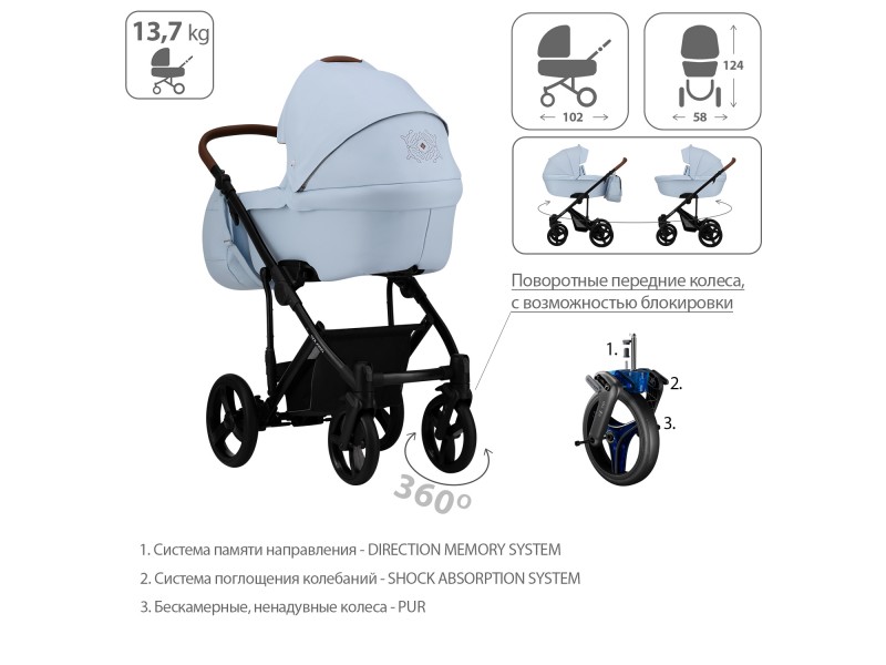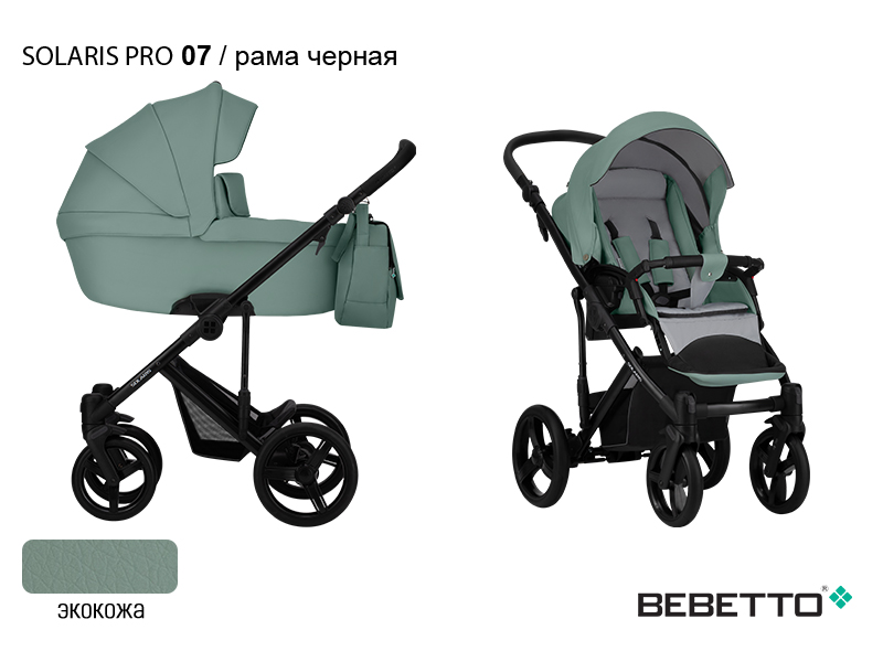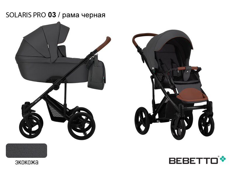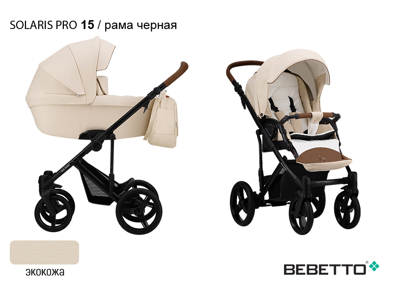 BEBETTO SOLARIS PRO (100% ЭКОКОЖА) 2 в 1 (Бебетто Соларис) - это элегантная и современная коляска, выполненная из экокожи. К отличительным особенностям данной модели можно отнести стильную вышивку на люльке коляски и изысканный дизайн конструкции. Неоспоримыми преимуществами Bebetto Solaris PRO являются: амортизация системы SAS на передних колесах, пружинная амортизация на каждом колесе задней оси и дополнительная амортизация на конструкции с регулировкой Soft или Hard (мягкий или жесткий). А защитный бортик от ветра на чехле спального блока и вместительная сумка для мамы с дополнительными кармашками станут приятными дополнениями ко всему вышеперечисленному. Bebetto Solaris PRO – это коляска для тех, кто любит изысканность и комфорт.