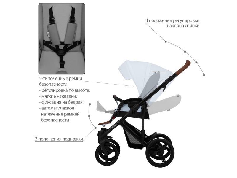 - Регулируемые 5-точечные ремни безопасности с мягкими накладками на плечи.