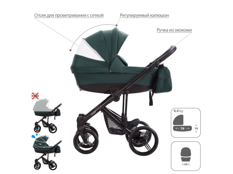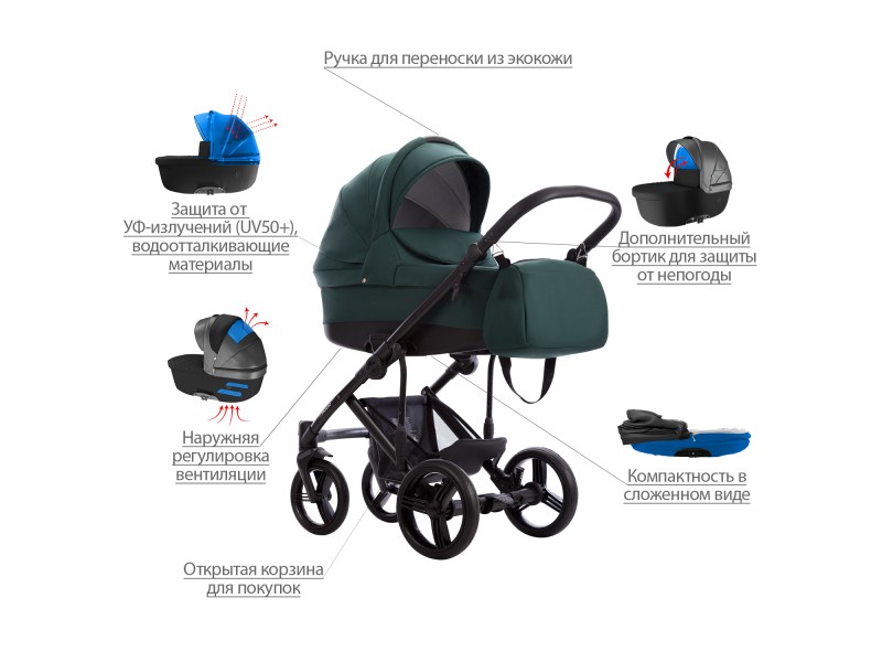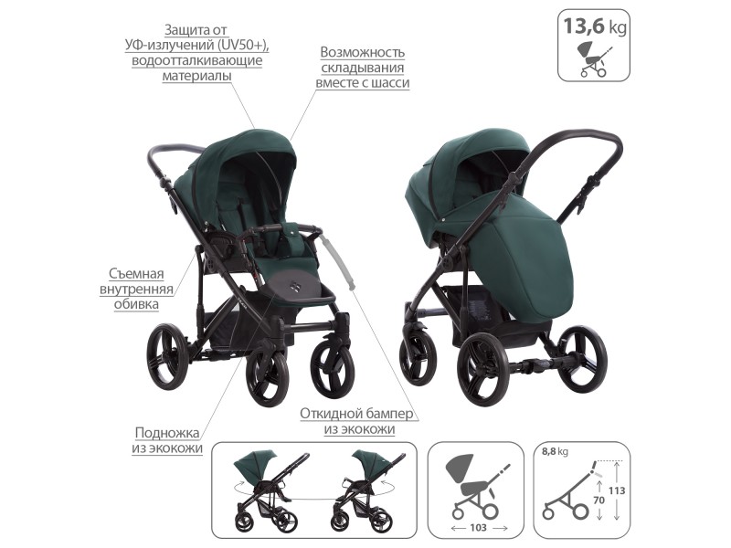 - Обивка коляски: водоотталкивающая, съемная, с УФ-защитой 50+.