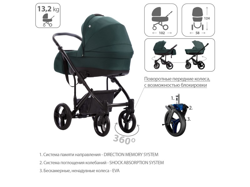 Чтобы коляска ехала мягко и плавно, в ней предусмотрены самые современные системы: системы SAS (поглощение колебаний) и DMS (память направления) на передних колесах, пружинная амортизация на каждом колесе задней оси и дополнительная амортизация на конструкции, с регулировкой Soft или Hard (мягкий или жесткий). Eva колеса позволят наслаждаться прогулками, не боясь спустить или проткнуть колесо. Все колеса легкосъемные для удобного и простого ухода, а так же для более компактной транспортировки рамы.
