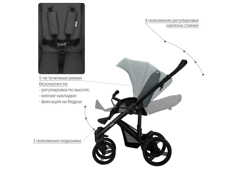 - Регулируемые 5-точечные ремни безопасности с мягкими накладками на плечи.