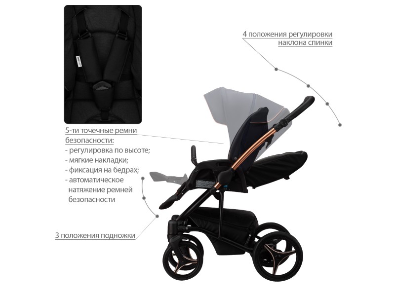 Регулируемые 5-точечные ремни безопасности с мягкими накладками на плечи.
