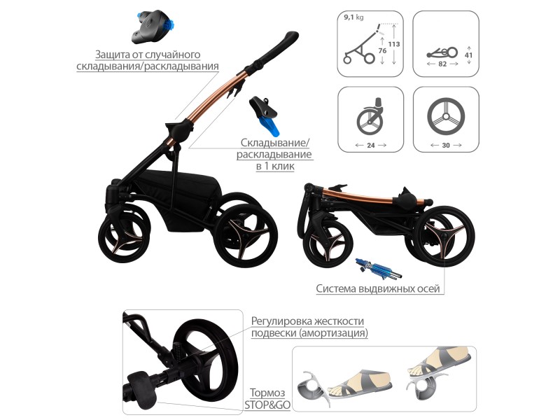 Рама из облегченного алюминия компактно складывается и поместится в любой автомобиль. Колеса у модели из вспененной резины, надежные, прочные, мягкие. Передние колеса оснащены необходимыми системами, чтобы любые неровности, дороги, ямы, препятствия преодолевались легко и мягко, не тревожив ребенка. Задние колеса увеличенного диаметра повышают проходимость модели и превращают коляску в настоящий внедорожник.