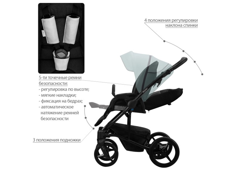 Регулируемые 5-точечные ремни безопасности с мягкими накладками на плечи.