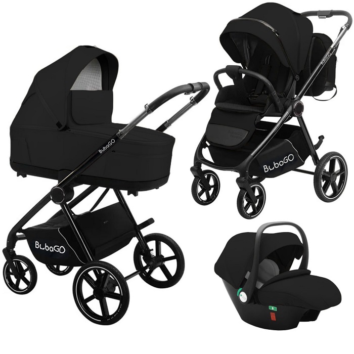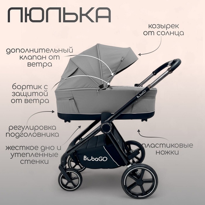 Коляска Bubago Niveta представлена в большой комплектации с люлькой для новорожденного, реверсивным прогулочным блоков и автолюлькой из тех же материалов, что и коляска, в той же цветовой гамме. Все модули оснащены эффектом памяти, то есть снимать блок можно поочередным нажатием кнопок с одной, а потом с другой стороны, что позволит снять люльку/прогулочный блок/автокресло всего одной рукой.