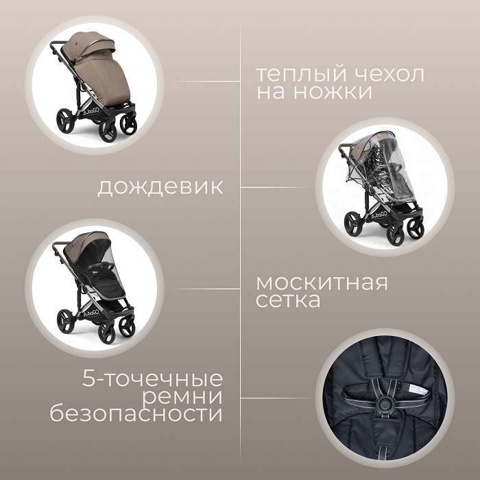 В комплекте: подстаканник, чехол на ножки, дождевик, москитная сетка, сумка, чехол на люльку с клапаном