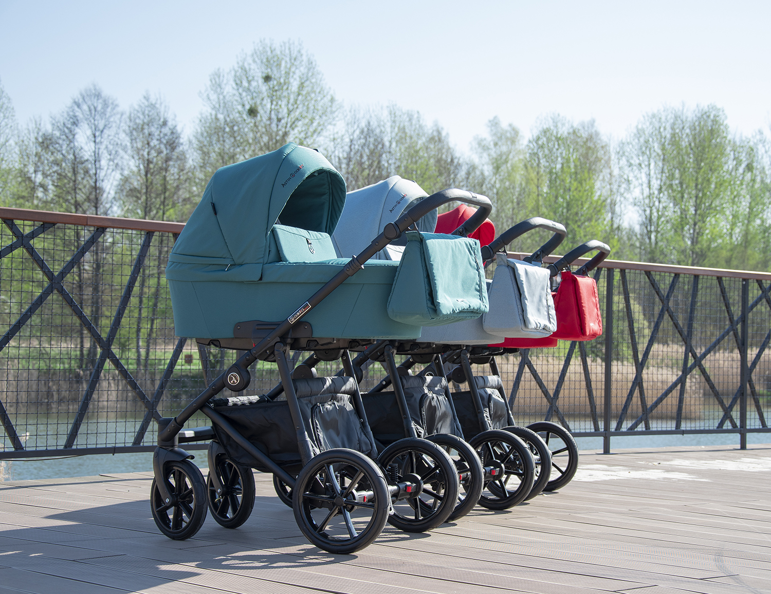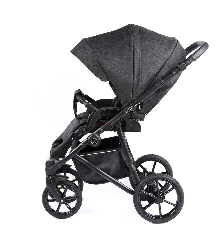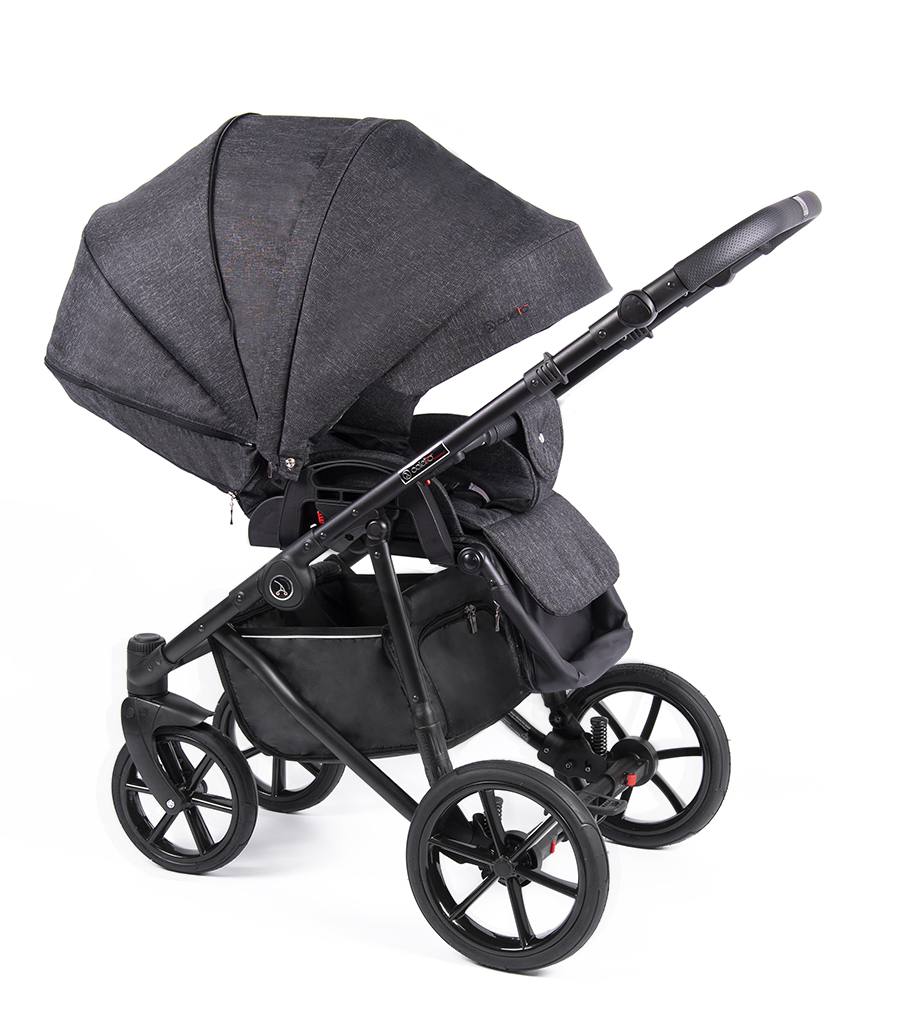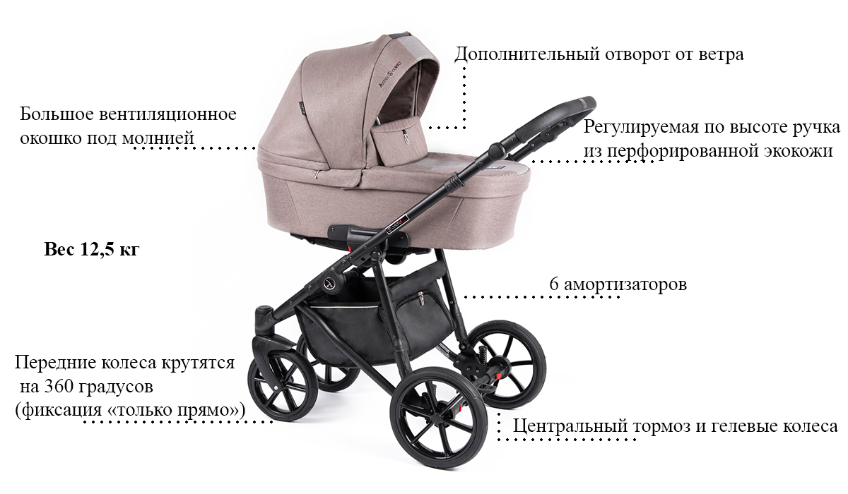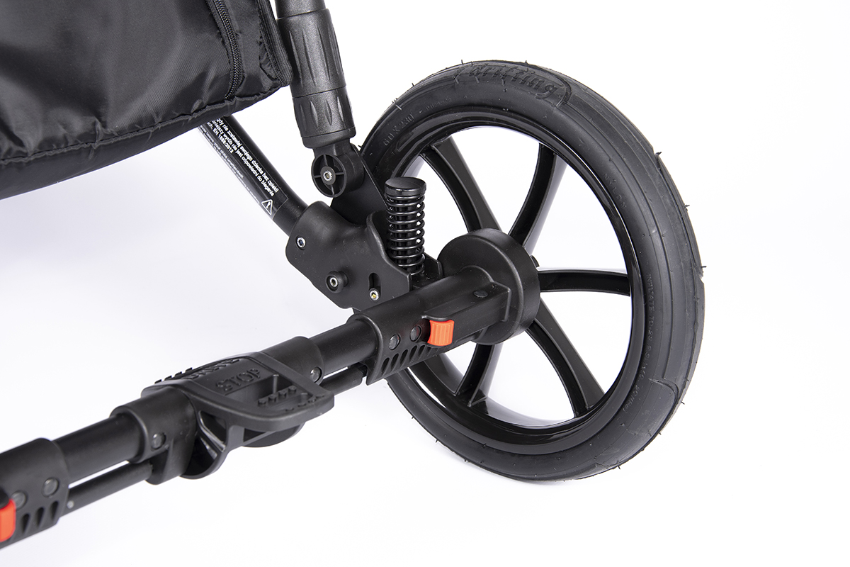 - 6 амортизаторов с регулировкой жесткости: мягкая подвеска, поглощает неровности дороги и обеспечивает комфортный ход коляски;