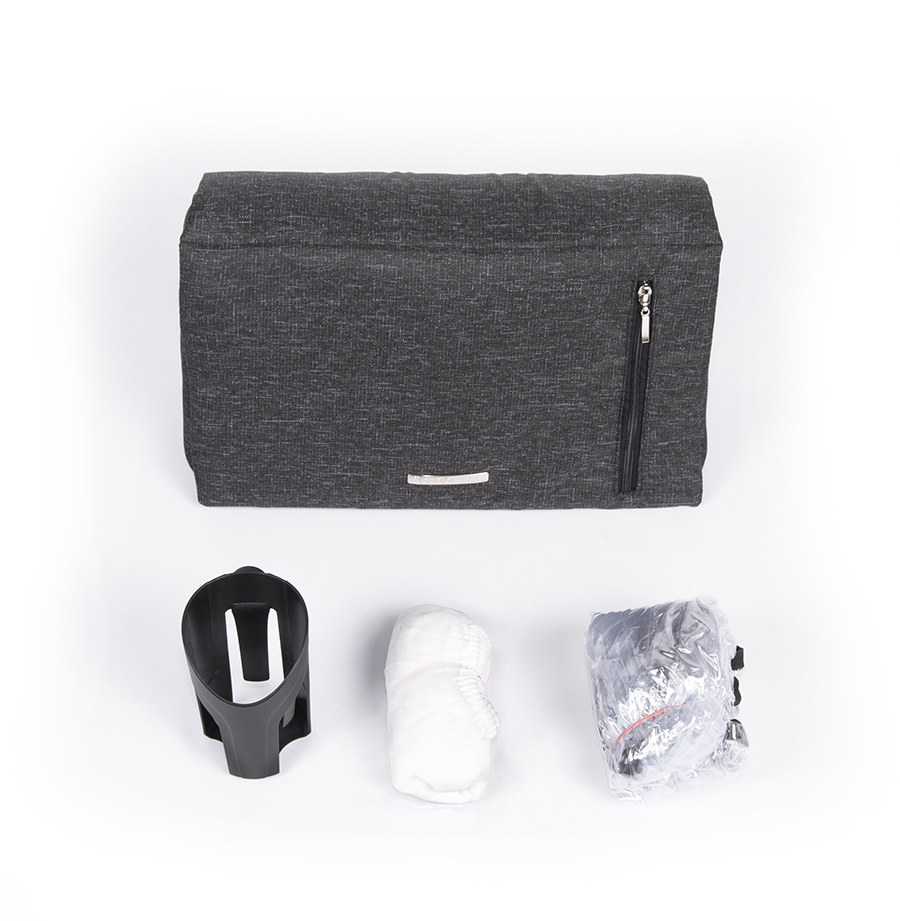 В комплект входят: сумка для мамы с дополнительным карманом, москитная сетка, дождевик, корзина для покупок, подстаканник, накидка на ножки