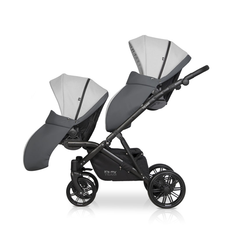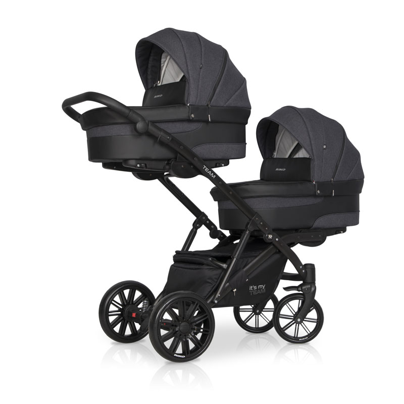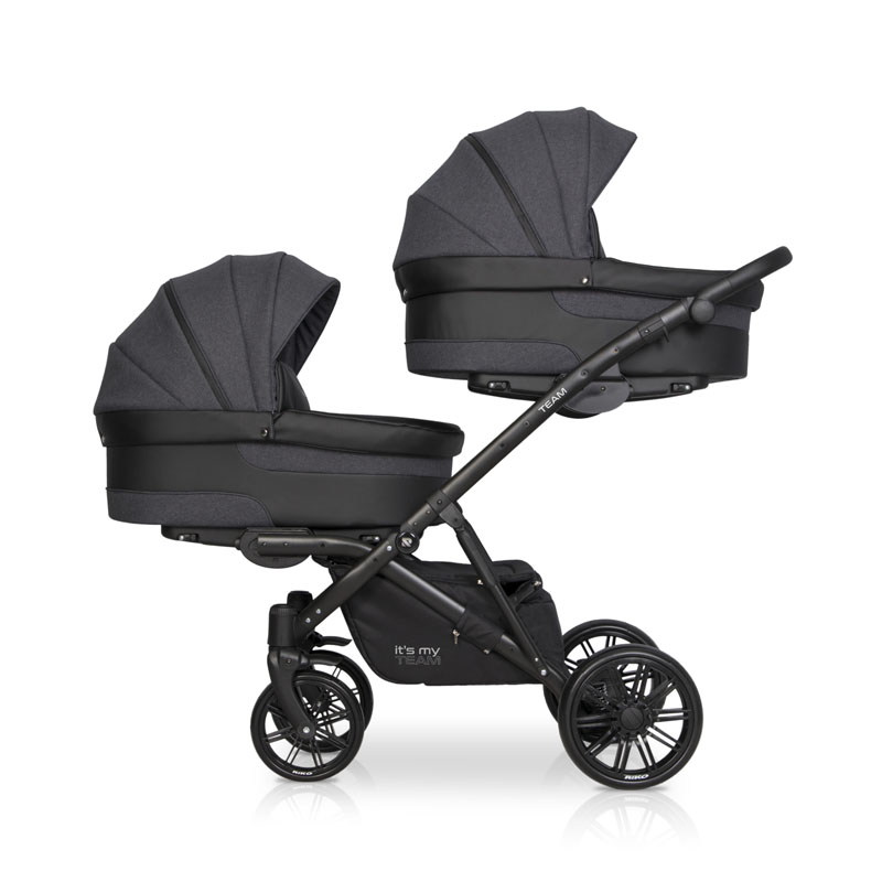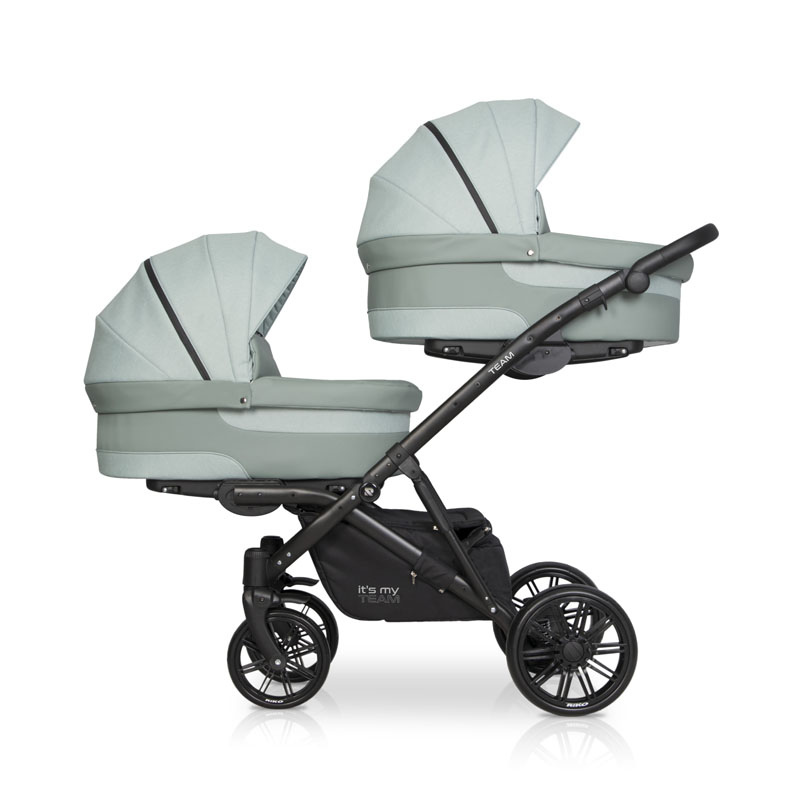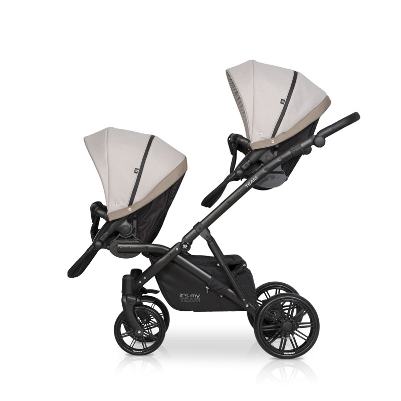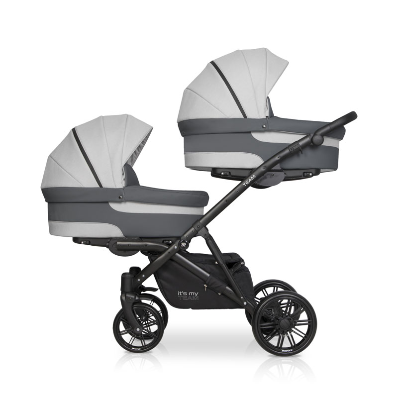 Коляска для двойни Riko Team 2 в 1 (Рико Теам) - обновленный вариант очень удобной, а главное, компактной коляски для двоих детей с рождения до 3-4 лет. Это коляска представлена на компактной раме, специально усиленной для использования сразу для двоих детей. Такая рама позволяет молодой маме без труда заезжать на любые пандусы, легко проезжать в подъезде и помещаться в лифт. Блоки расположены высоко от земли, а между блоками есть удобное расстояние для контроля за малышами. В сложенном виде рама очень компактно и практически не отличается от обычной стандартной коляски для одного ребенка.