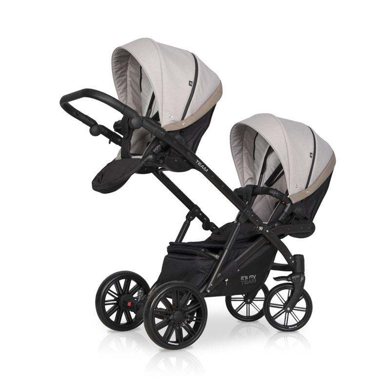Все блоки легко переставляются в зависимости от возраста детей и их потребностей. Коляска может использоваться как для двоих детей одного возраста, так и для погодок.