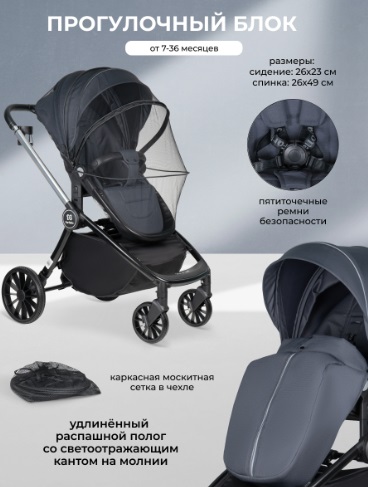 Прогулочный блок предусмотрен для детей старше 6 месяцев. Он имеет 3 положения наклона спинки: сидя, полулежа и лежа. Бампер ограничитель можно полностью снять или отстегнуть для удобной посадки и высадки ребенка. Для безопасности малыша предусмотрены удобные 5-титочечные ремни безопасности и межножный ограничитель от сползания. Удобный капюшон укроет от солнца и осадков.