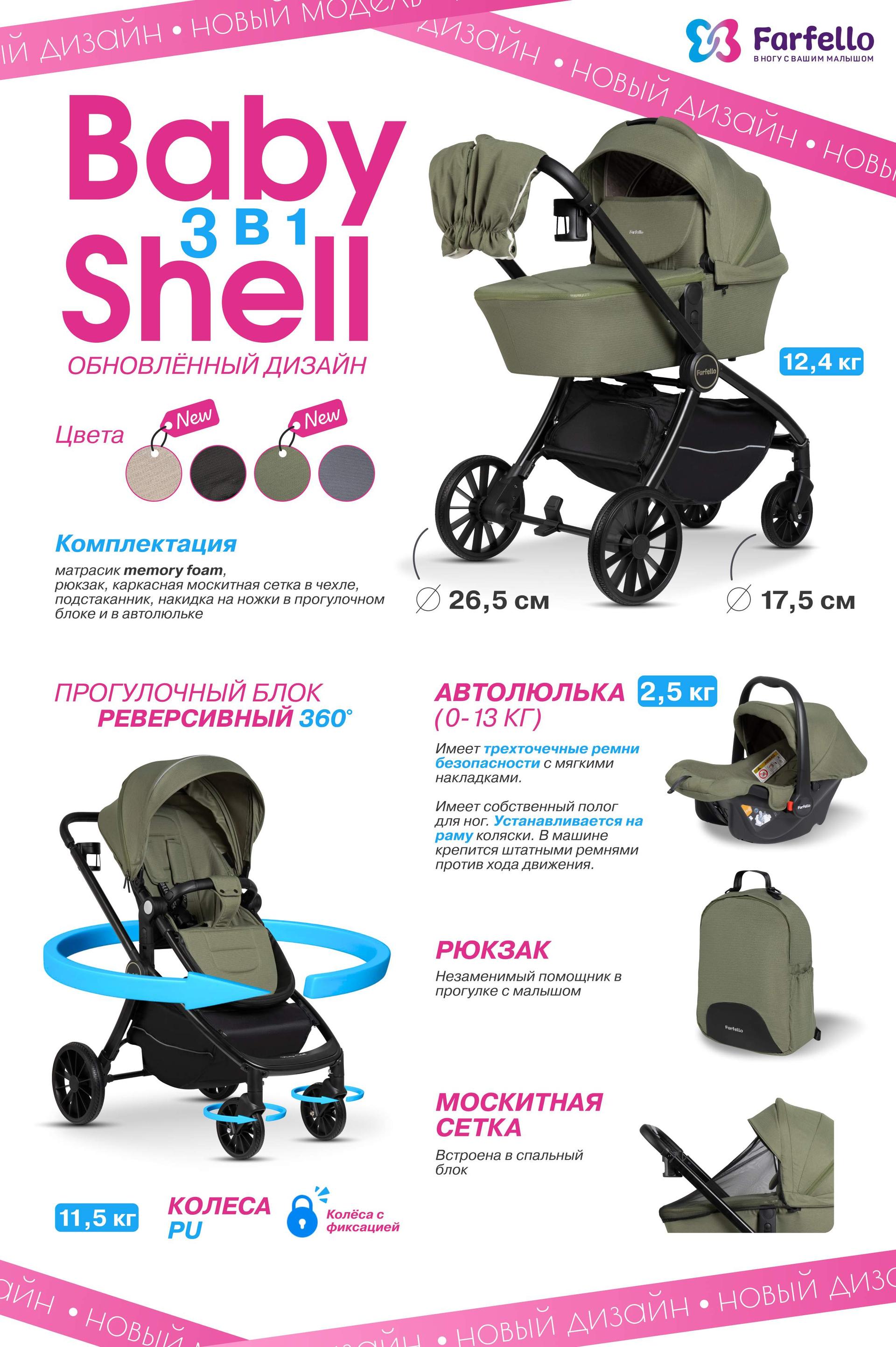 Детская коляска Farfello Baby Shell 3 в 1 New (фарфелло беби шел ) - детская коляска с легким весом, качественной обивкой и по очень привлекательной цене. У коляски современный дизайн, интересные расцветки и большой функционал.