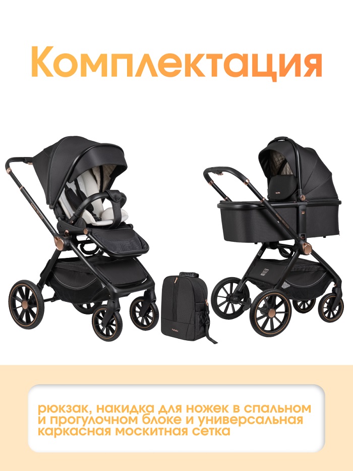 В комплекте рюкзак, накидка для ножек в спальном и прогулочном блоке и универсальная каркасная москитная сетка.
