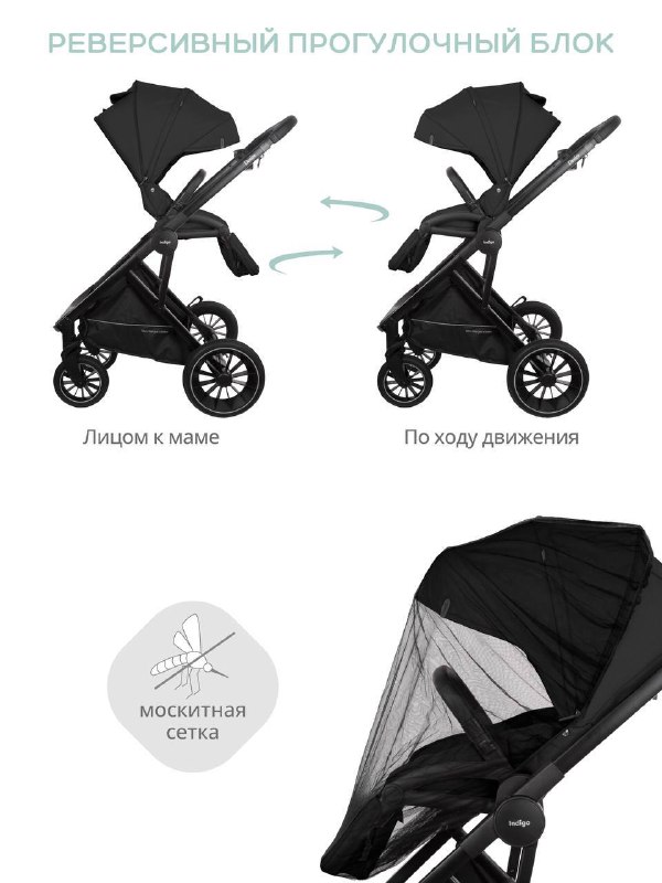 Прогулочный блок коляски реверсивный. Его можно установить по ходу и против хода движения, что позволит удобно общаться с ребенком во время прогулки. Спинка регулируется по высоте до горизонтального положения, позволяя ребенку комфортно спать на улице. Для защиты от непогоды предусмотрен большой капюшон со смотровым окошком и теплая накидка на ножки с удобным доступом к ребенку.