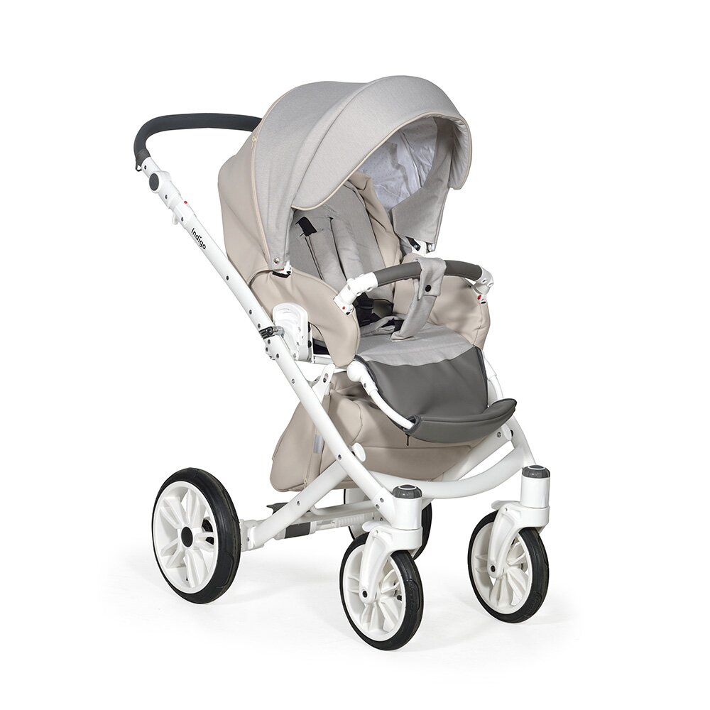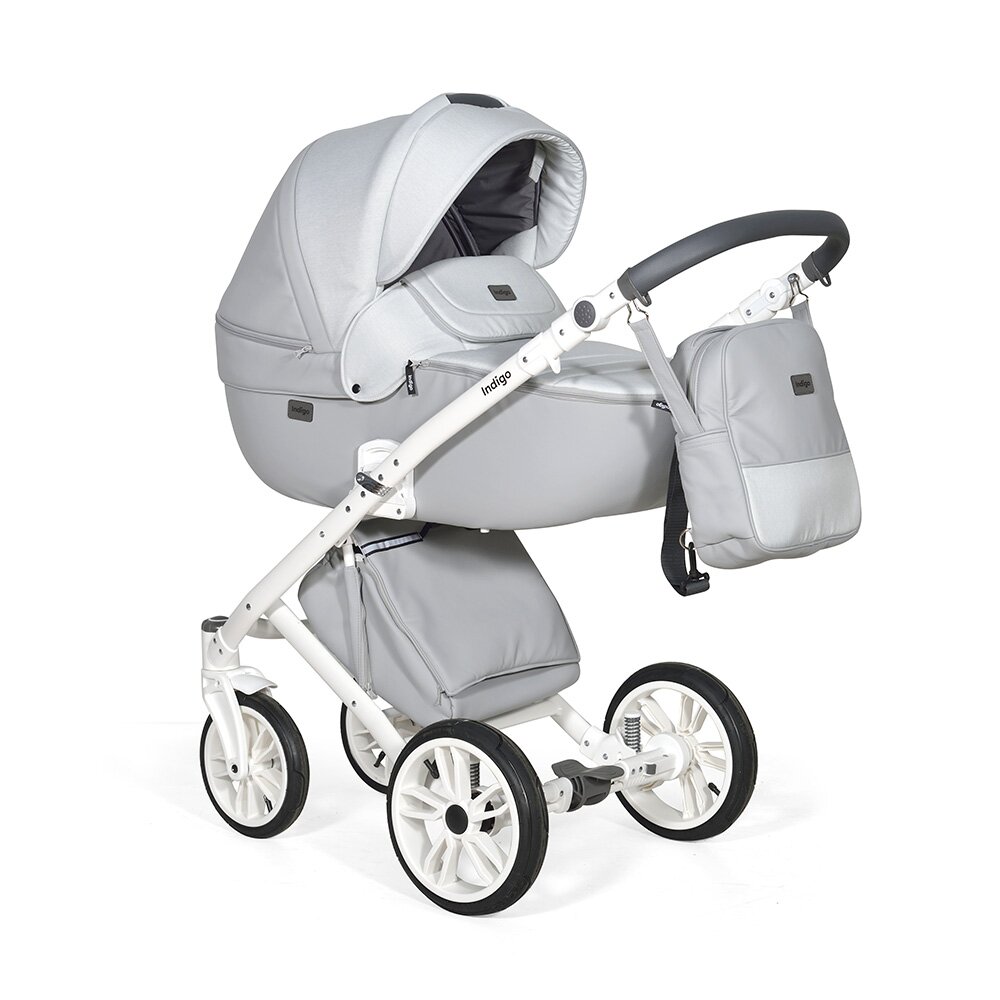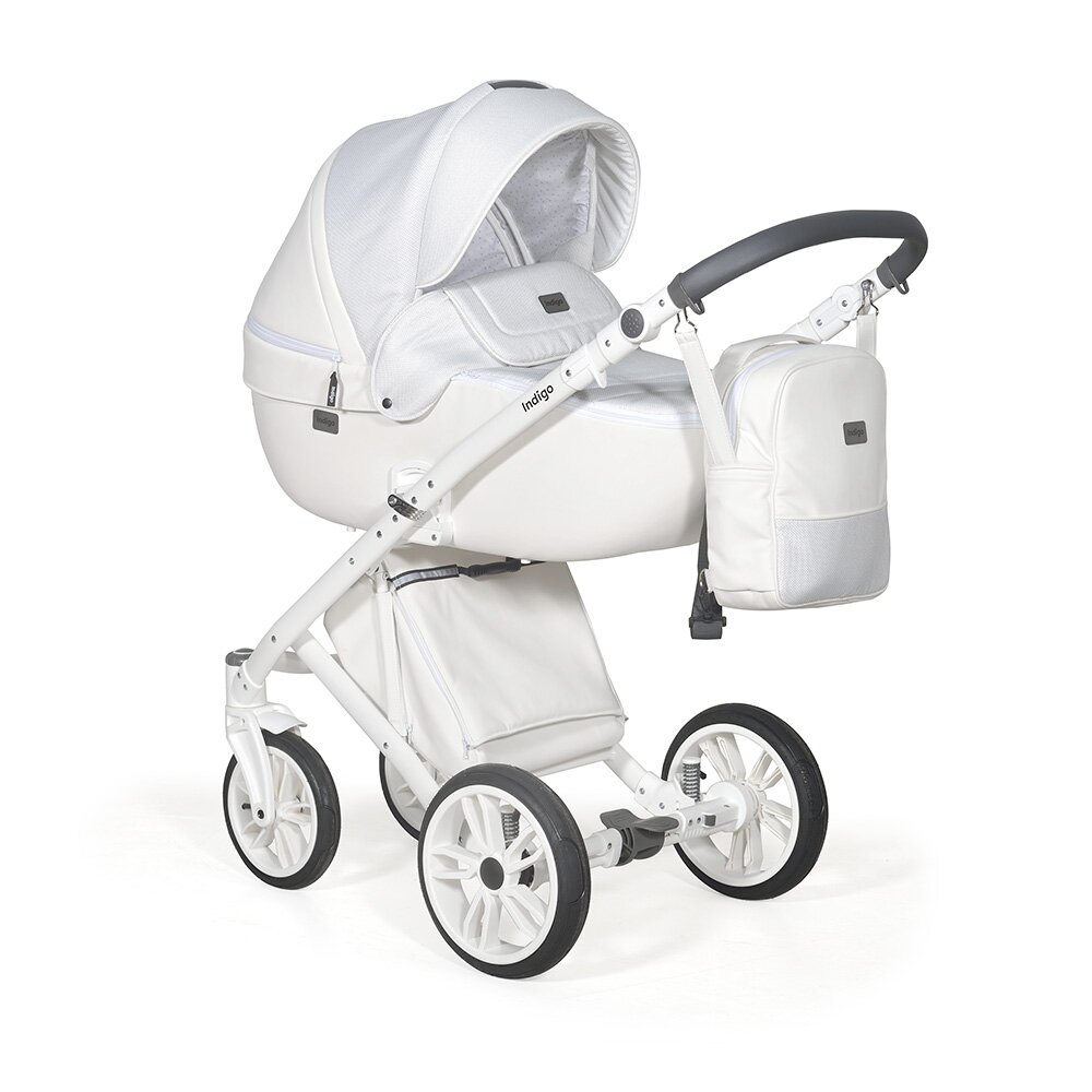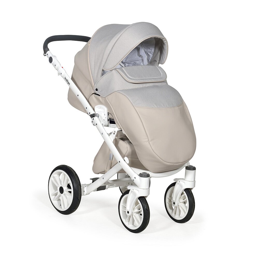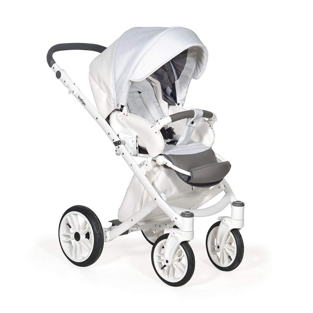 Коляска Indigo PORTO 2 в 1 (Индиго Порто) - красивая стильная коляска на белоснежной раме ( кроме расцветки в черном цвете) с двумя съемными блоками: люлькой для ребенка с рождения до 9 кг, и прогулочным блоком для ребенка от 6 месяцев до 3-4 лет. У модели очень большая красивая люлька с большим капюшоном, откидным ветровиком с возможностью смотреть за малышом через небольшое окошко. В люльке предусмотрены вентиляционные отверстия в капюшоне, удобная ручка для переноски и регулируемый подголовник. Сама люлька выполнена из качественного пластика и обтянута эко кожей, что обеспечит ребенку высокую защиту от ветра и непогоды. Удобная система One Touch System позволит без труда и лишних движений снимать и ставить на раму люльку или прогулочный блок в зависимости от возраста ребенка. Прогулочный блок отличается своим очень продуманным и элегантным видом. Коляска не выглядит массивно, и с прогулочным блоком смотрится очень эффектно. Прогулочный блок можно установить по ходу и против хода движения, что удобно для детей до года. В прогулочном варианте предусмотрено много регулировок спинки и подножки, чтобы ребенку было удобно не только гулять, но и спать на улице. У модели аккуратная рама с компактным сложением и надувные колеса с низкопрофильной резиной.