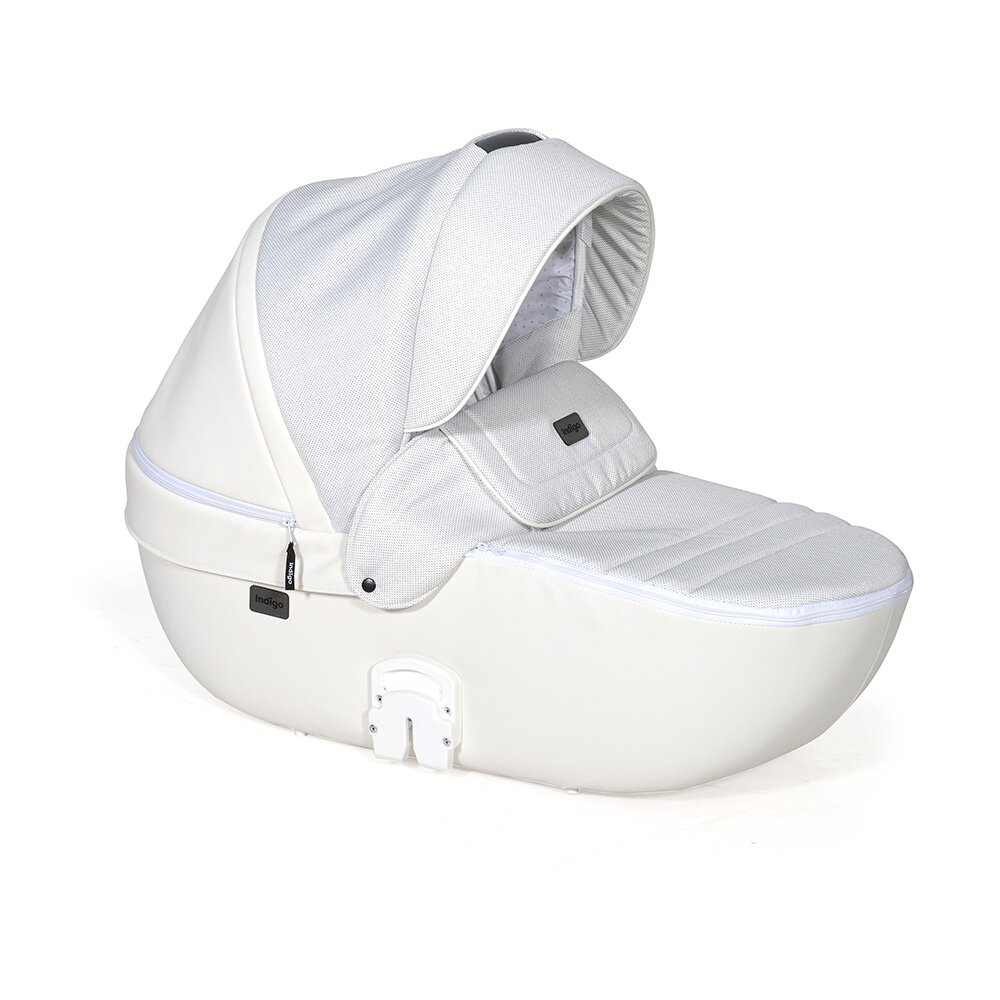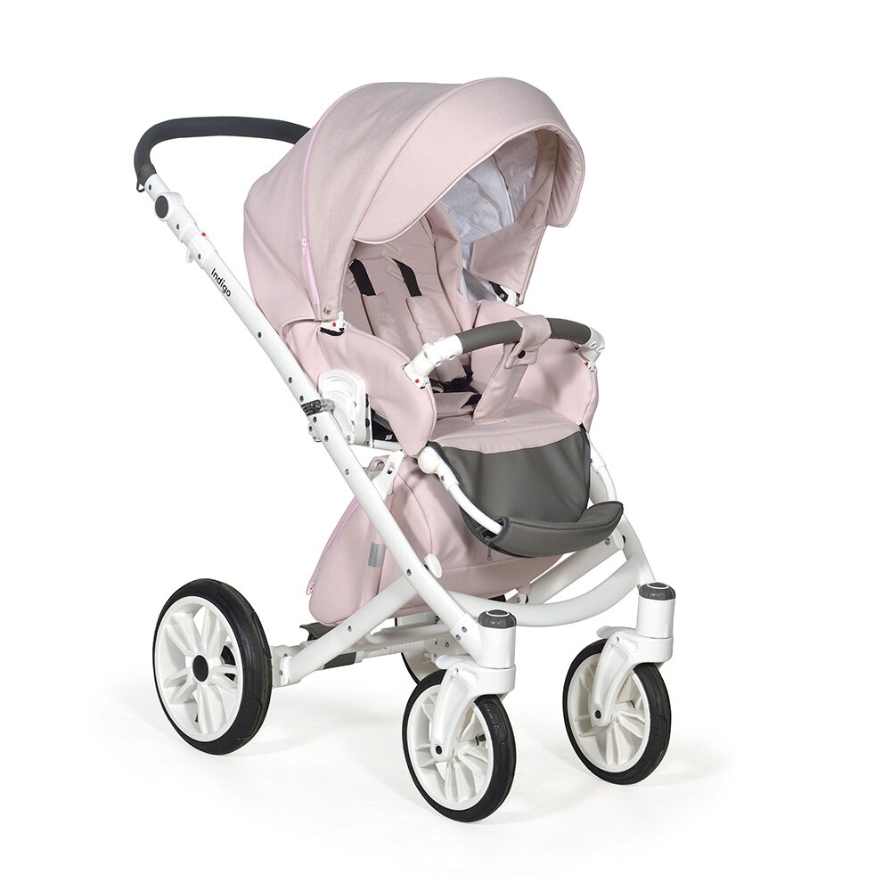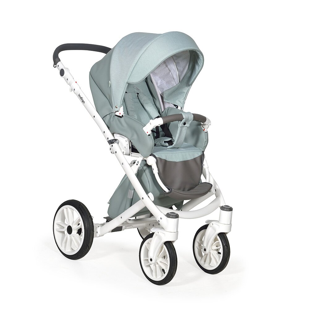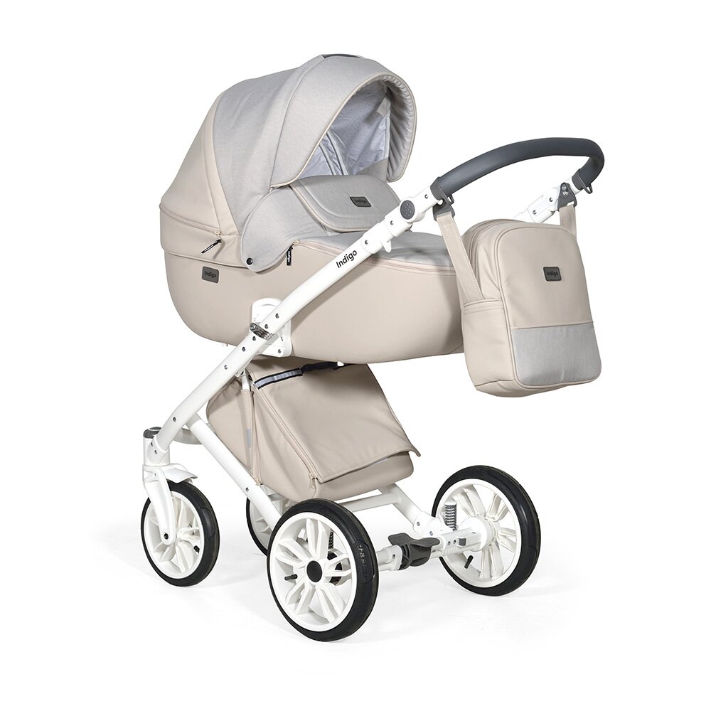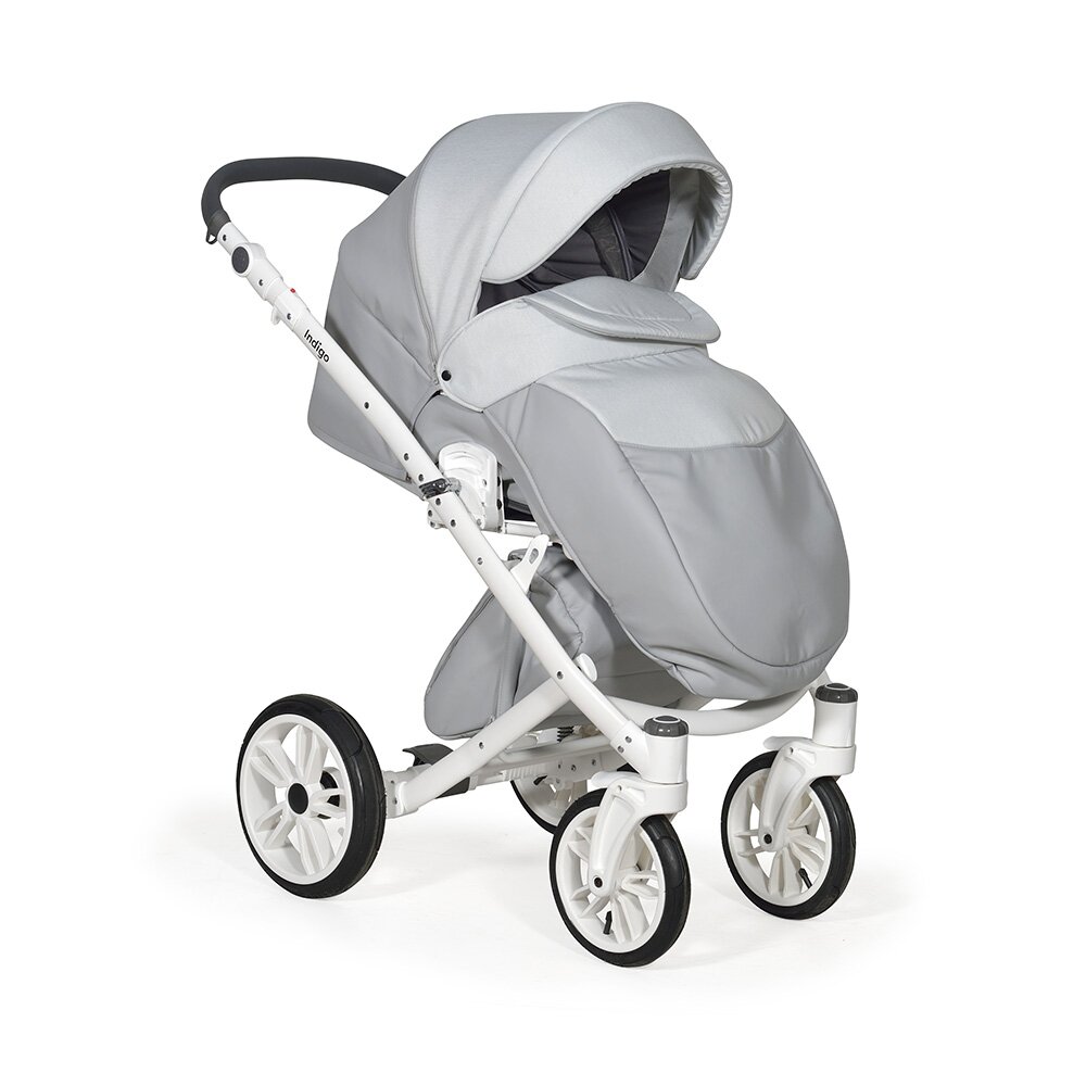 Коляска Indigo PORTO 2 в 1 (Индиго Порто) - красивая стильная коляска на белоснежной раме ( кроме расцветки в черном цвете) с двумя съемными блоками: люлькой для ребенка с рождения до 9 кг, и прогулочным блоком для ребенка от 6 месяцев до 3-4 лет. У модели очень большая красивая люлька с большим капюшоном, откидным ветровиком с возможностью смотреть за малышом через небольшое окошко. В люльке предусмотрены вентиляционные отверстия в капюшоне, удобная ручка для переноски и регулируемый подголовник. Сама люлька выполнена из качественного пластика и обтянута эко кожей, что обеспечит ребенку высокую защиту от ветра и непогоды. Удобная система One Touch System позволит без труда и лишних движений снимать и ставить на раму люльку или прогулочный блок в зависимости от возраста ребенка. Прогулочный блок отличается своим очень продуманным и элегантным видом. Коляска не выглядит массивно, и с прогулочным блоком смотрится очень эффектно. Прогулочный блок можно установить по ходу и против хода движения, что удобно для детей до года. В прогулочном варианте предусмотрено много регулировок спинки и подножки, чтобы ребенку было удобно не только гулять, но и спать на улице. У модели аккуратная рама с компактным сложением и надувные колеса с низкопрофильной резиной.