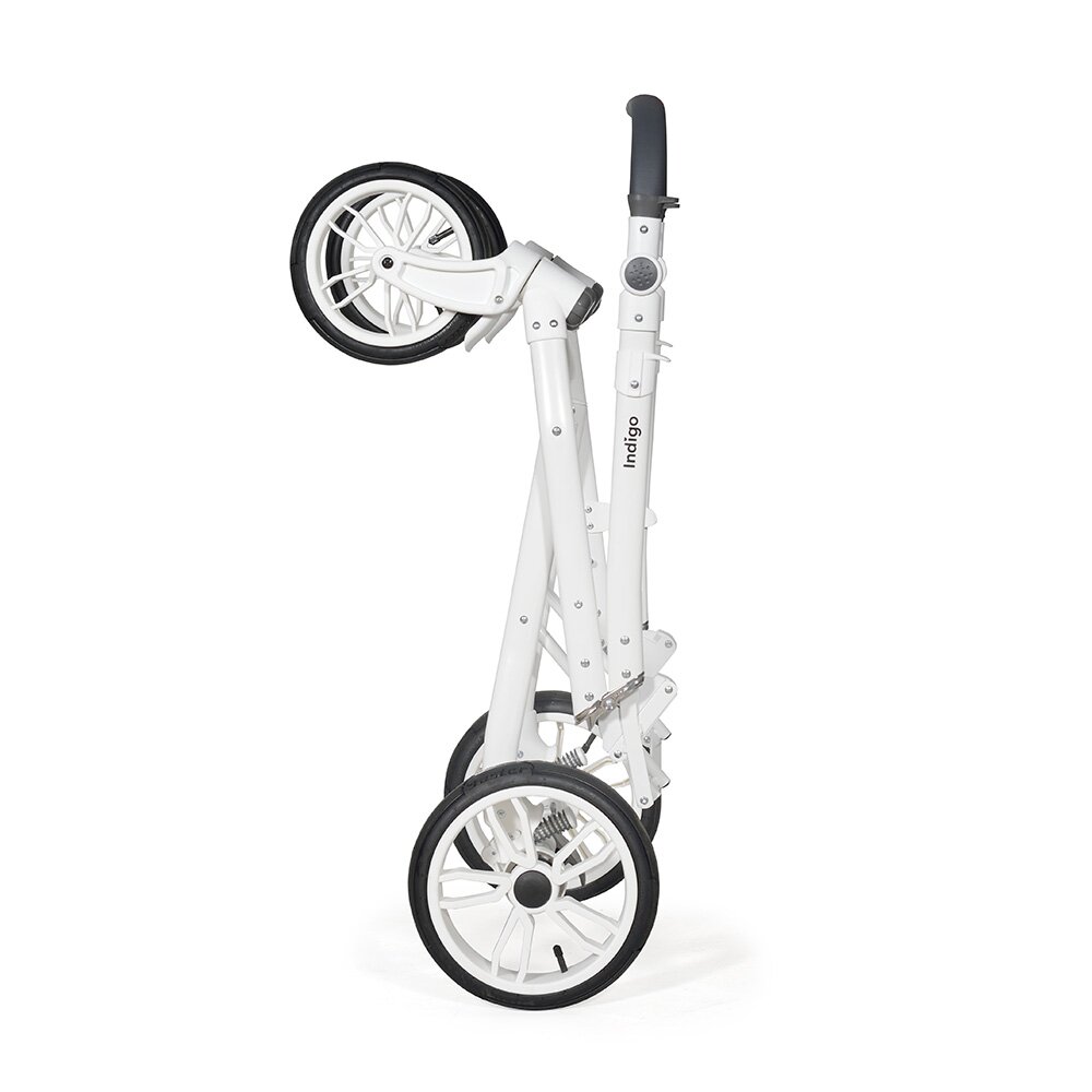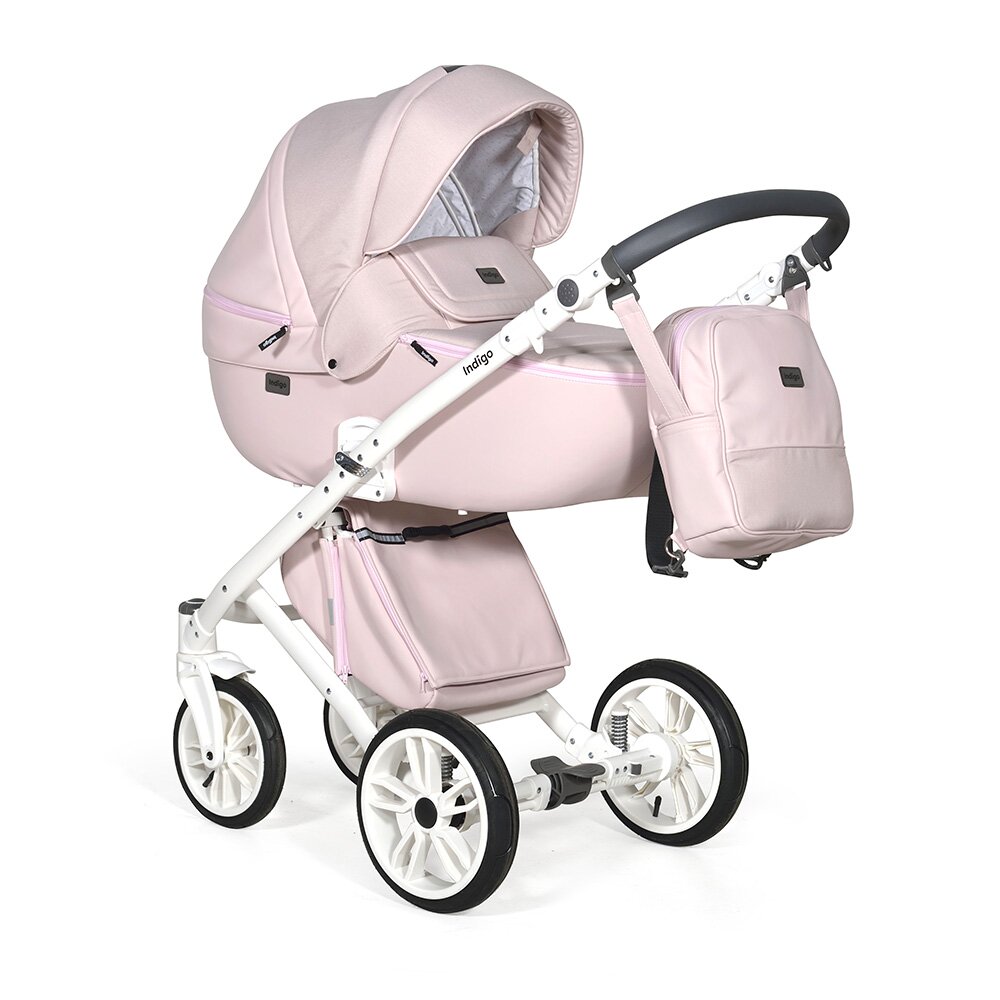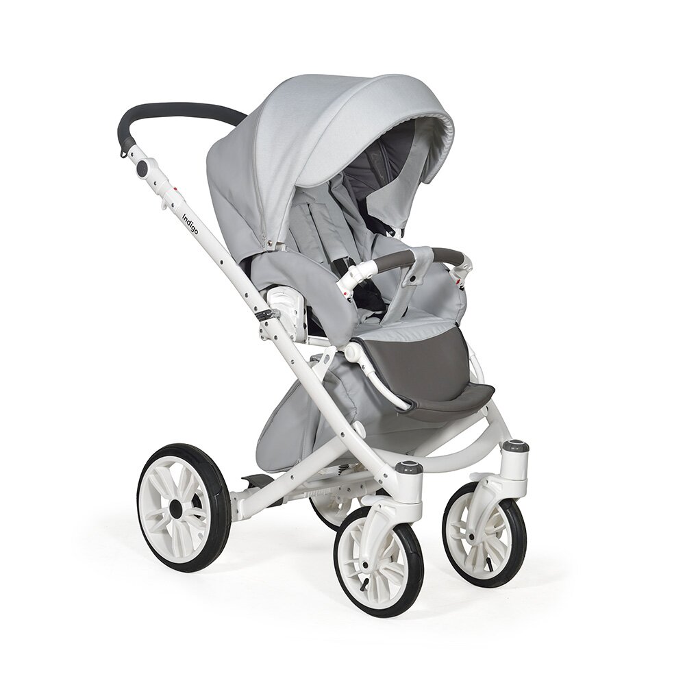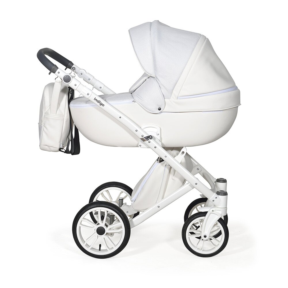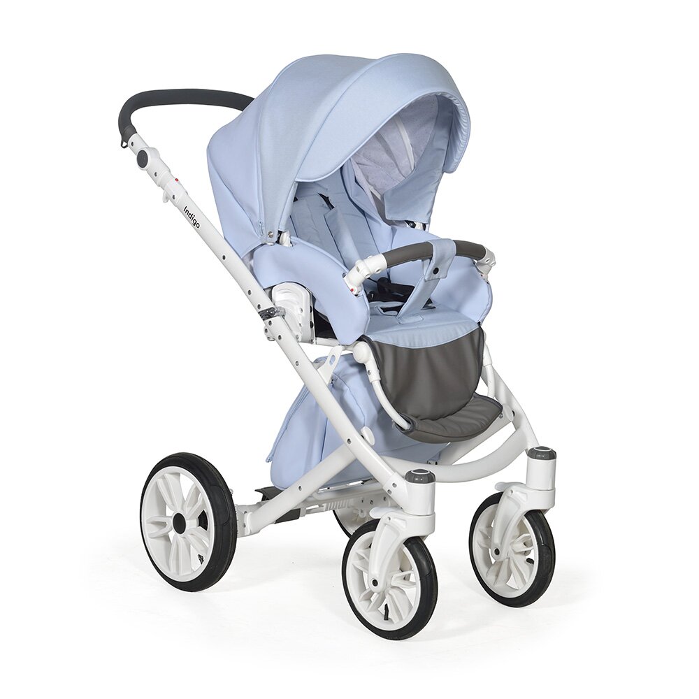 Коляска Indigo PORTO 2 в 1 (Индиго Порто) - красивая стильная коляска на белоснежной раме ( кроме расцветки в черном цвете) с двумя съемными блоками: люлькой для ребенка с рождения до 9 кг, и прогулочным блоком для ребенка от 6 месяцев до 3-4 лет. У модели очень большая красивая люлька с большим капюшоном, откидным ветровиком с возможностью смотреть за малышом через небольшое окошко. В люльке предусмотрены вентиляционные отверстия в капюшоне, удобная ручка для переноски и регулируемый подголовник. Сама люлька выполнена из качественного пластика и обтянута эко кожей, что обеспечит ребенку высокую защиту от ветра и непогоды. Удобная система One Touch System позволит без труда и лишних движений снимать и ставить на раму люльку или прогулочный блок в зависимости от возраста ребенка. Прогулочный блок отличается своим очень продуманным и элегантным видом. Коляска не выглядит массивно, и с прогулочным блоком смотрится очень эффектно. Прогулочный блок можно установить по ходу и против хода движения, что удобно для детей до года. В прогулочном варианте предусмотрено много регулировок спинки и подножки, чтобы ребенку было удобно не только гулять, но и спать на улице. У модели аккуратная рама с компактным сложением и надувные колеса с низкопрофильной резиной.