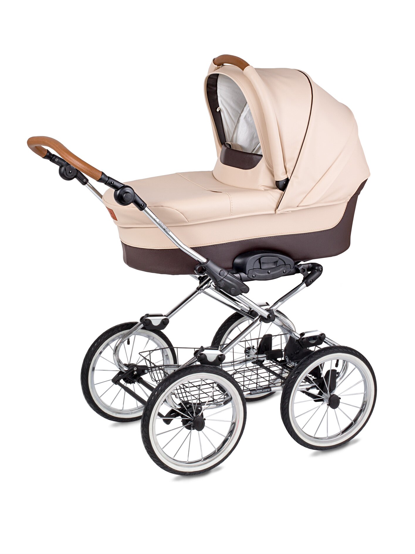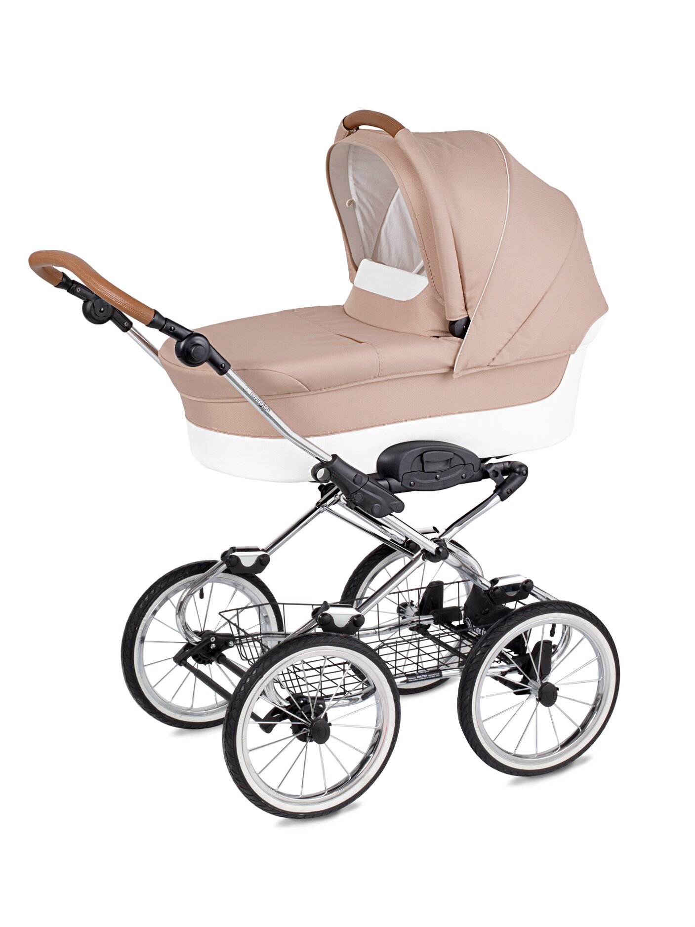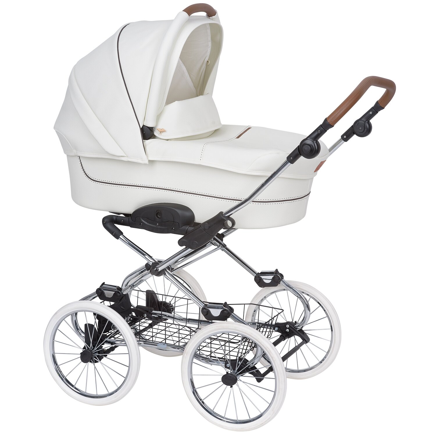 Детская коляска-люлька Navington Caravel EVA Wels (навингтон каравел) - красивая коляска на классической раме с большими поворотными колесами белоснежного цвета. Самая мягкая амортизация из всех существующих подарит ребенку максимально комфортную поездку независимо от состояния дорог. За счет поворотный колес эта роскошная "карета" очень просто управляется и более маневренная по сравнению с неповоротными колесами. Качественные ткани, отсутствие пластика и сдержанный европейский стиль ждет обладателя этого прекрасного транспорта.