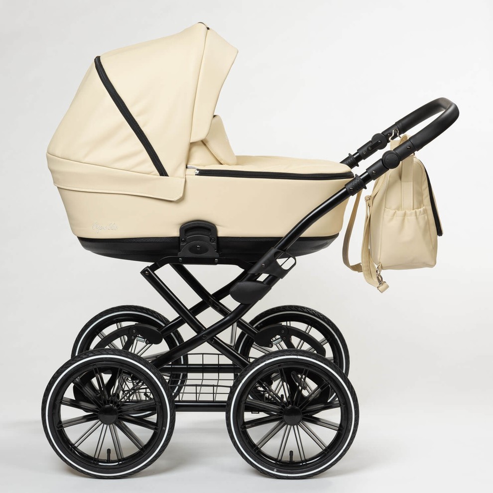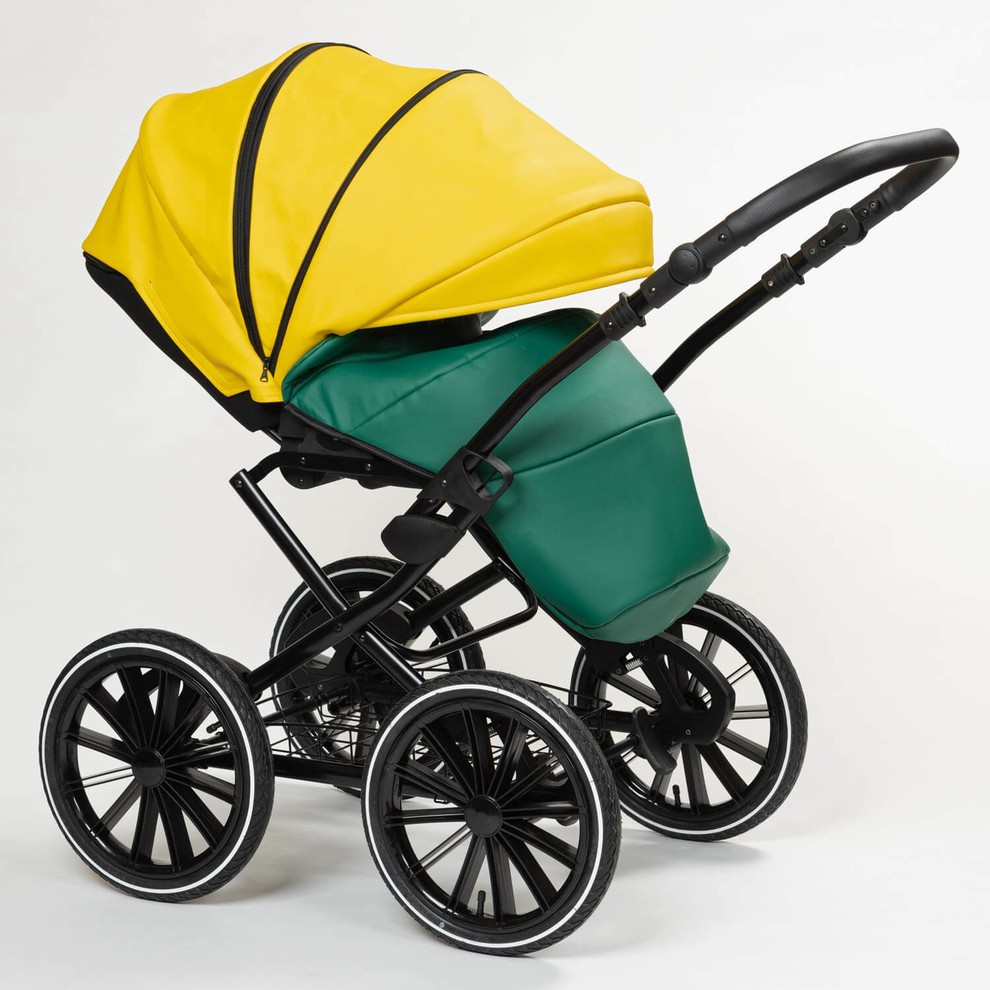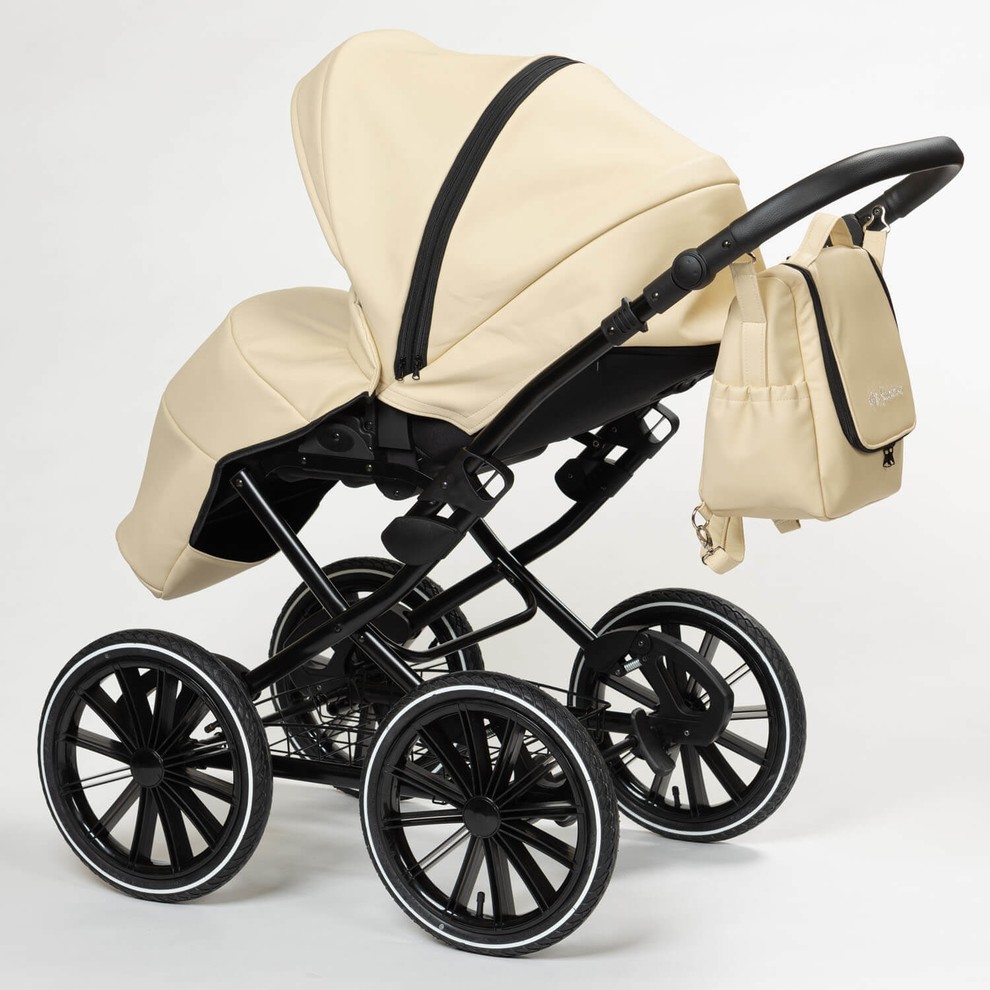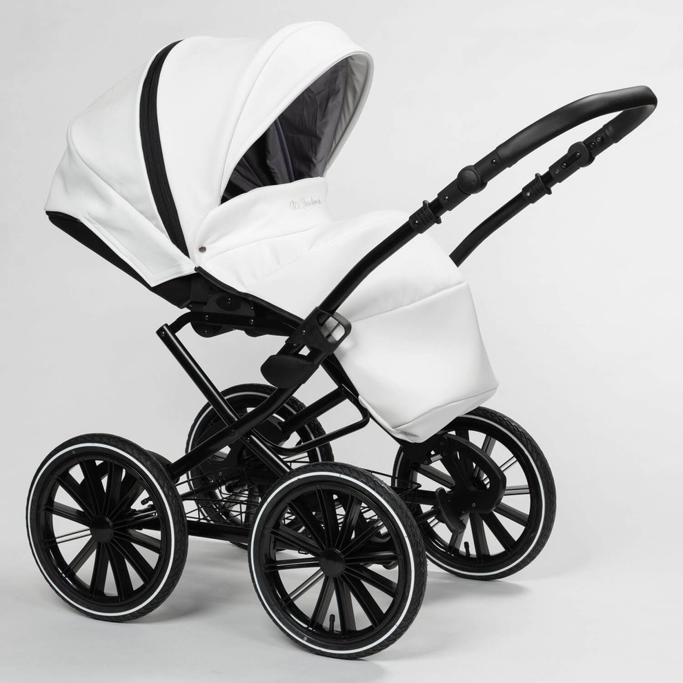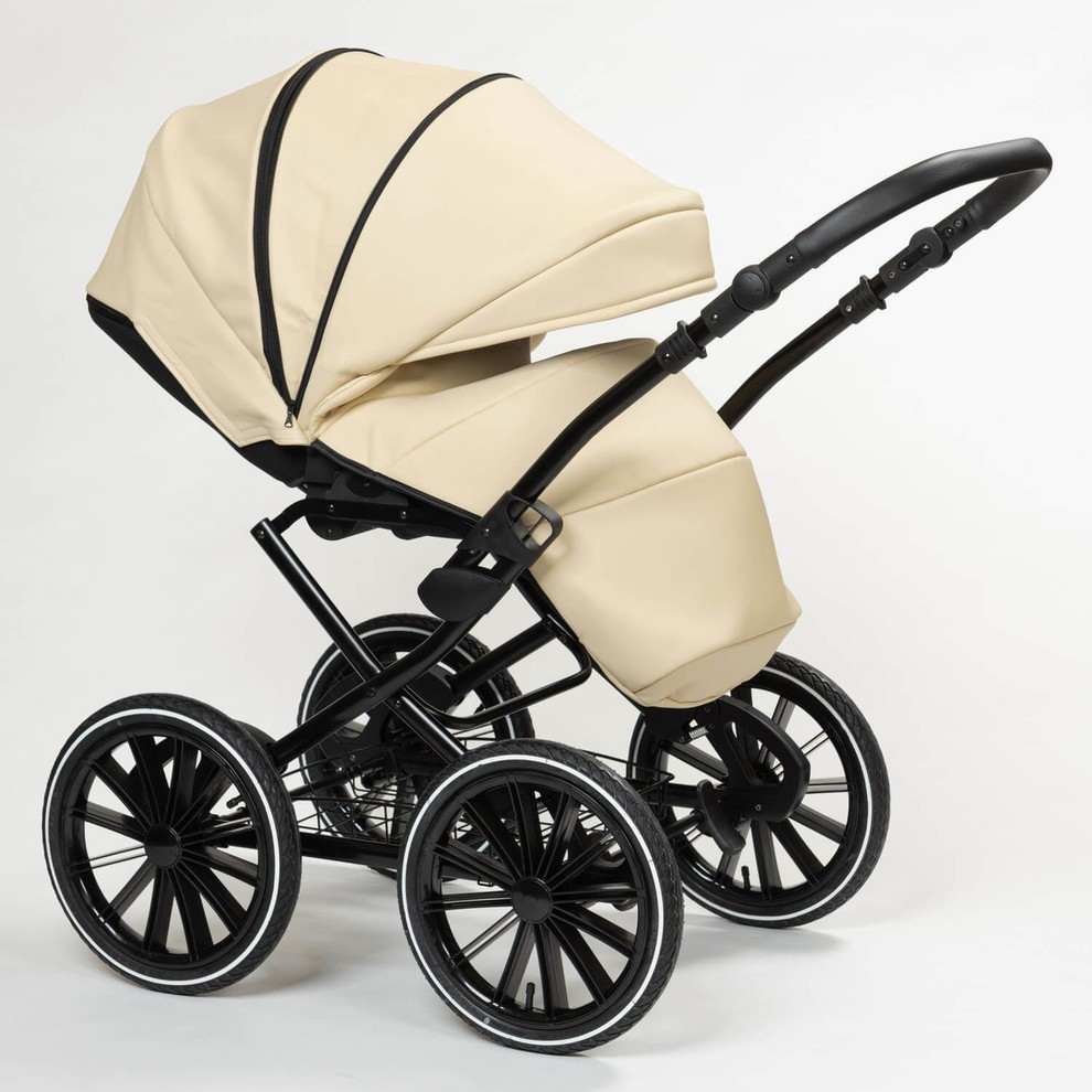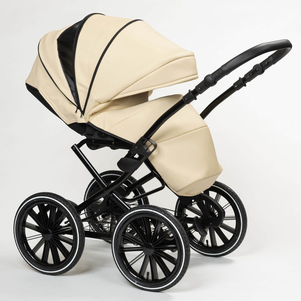 Модель представлена в двух вариантах обивки. Полностью из эко кожи коляску можно купит в белом, черном, бежевом цвете и комбинированные расцветки 13 и 14. Остальные расцветки - сочетание жаккардовой ткани с водоотталкивающей пропиткой и эко кожей.