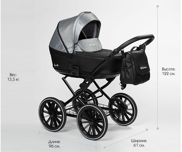 - Габариты коляски с люлькой (ДхШхВ): 96 см х 61 см х 122см