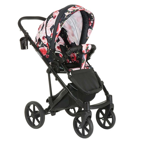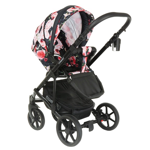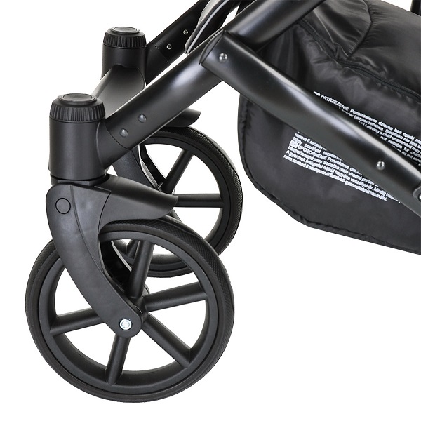 Рама коляски выполнена из легкого алюминия. Она компактно складывается, удобна при хранении и транспортировки. Рама оснащена современными гелевыми колесами, которые имеют свойства надувных, но не прокалываются и более просты в эксплуатации. Продуманная, регулируемая амортизация поможет настроить ход коляски под качество дорог. Коляска отлично управляется за счет передних поворотных колес. В комплектацию модели входит большая корзина для покупок, сумка для мамы, дождевик и сетка от насекомых.