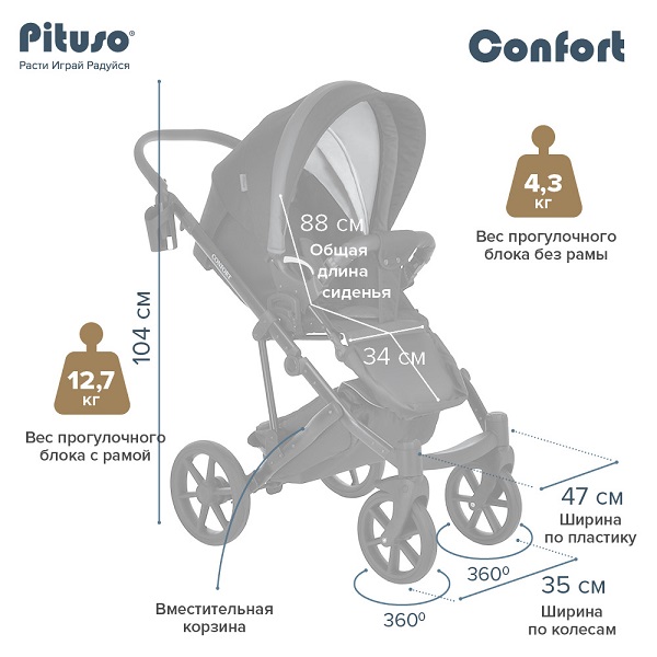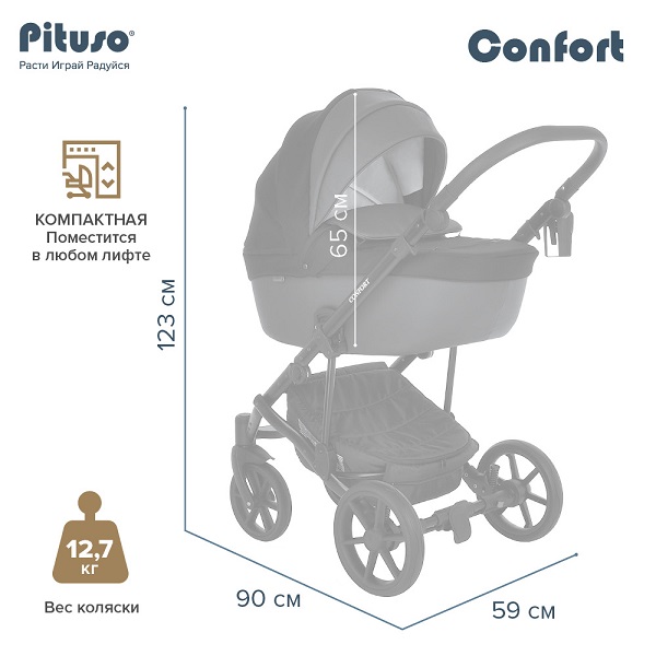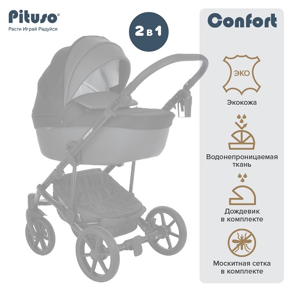 Коляска PITUSO CONFORT PLUS 2 в 1 (Питусо конфорт плюс) - прекрасный вариант практичной, эффектной и качественной коляски по приемлемой цене. Такая коляска подойдет для ребенка с рождения до 3-4 лет и имеет премиальное качество. Люлька и прогулочный блок выполнены с учетом всех стандартов безопасности для ребенка и будут максимально удобны для ребенка и его родителей.