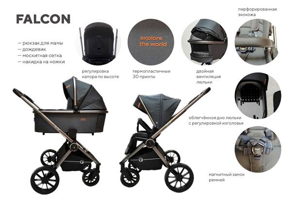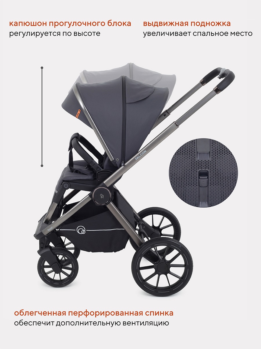 Детская коляска Rant Falcon 2 в 1 (Рант фалькон) - Флагманскую модель с современной начинкой и концептуальным дизайном по достоинству оценят молодые прогрессивные родители. Детская коляска 2 в 1 покорит вас: абсолютной инновацией - магнитным замком на ремне безопасности, быстросъемной люлькой с памятью кнопок, регулировкой капюшона в прогулочном блоке по высоте, складной люлькой для хранения и транспортировки, трендовой палитрой цветов вкупе с премиальной тканью.