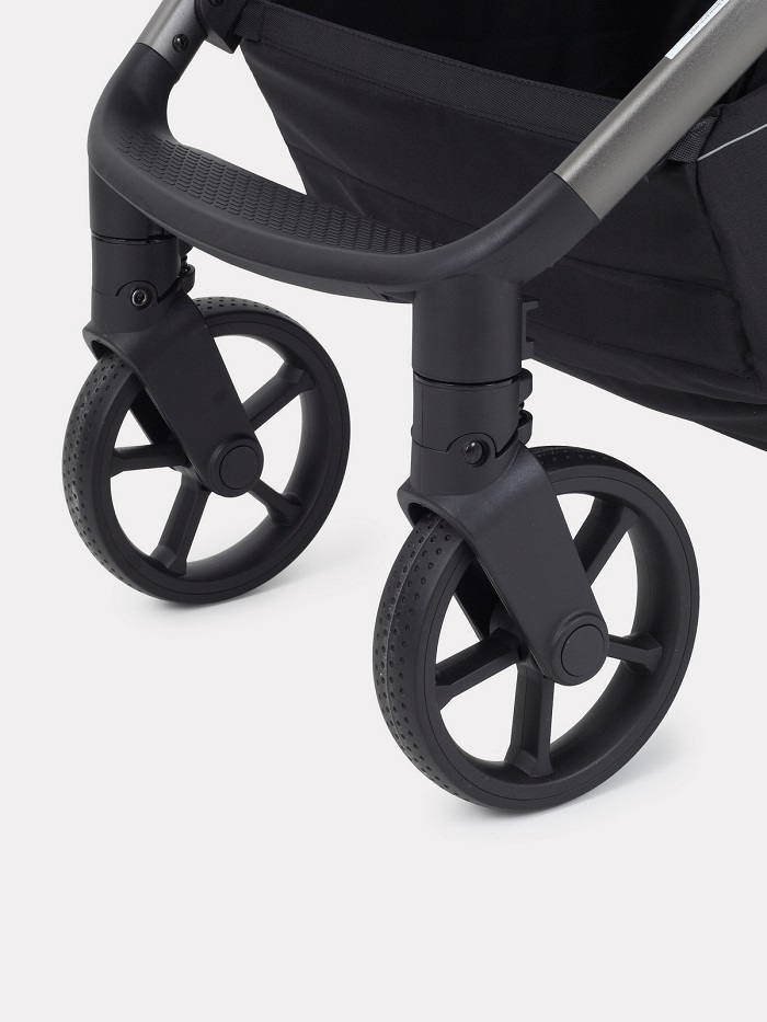 Колеса, выполненные из цельной резины, и амортизация как на передних, так и на задних колесах дарят коляске мягкий ход и абсолютную проходимость